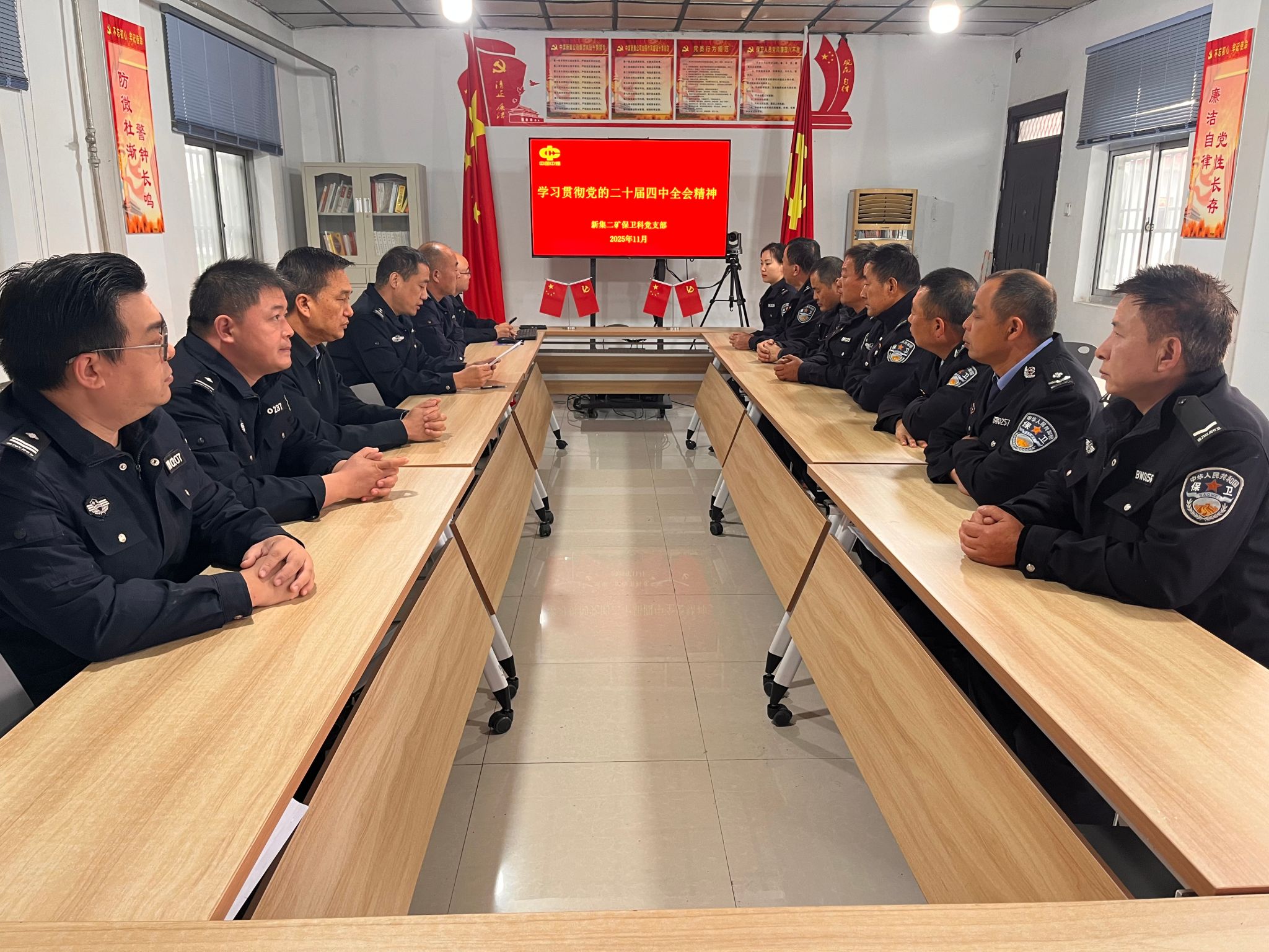 活动伊始,支部书记带领全体职工系统学习全会公报核心内容,重点解读“统筹发展和安全”“建设更高水平的平安中国”等重要论述,结合矿区“绿色矿山、清洁能源”发展战略,阐明保卫工作在矿区安全防控等领域的关键作用。
