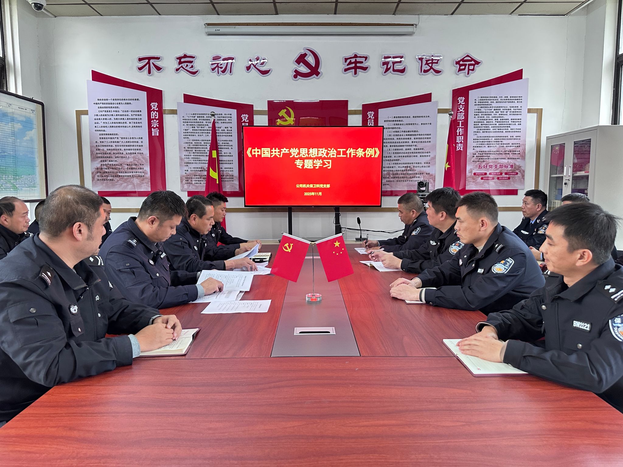 会上由支部书记带领全体党员学习《条例》内容,深刻阐释其制定背景、重大意义、主要内容和实践要求。着重强调《条例》是以习近平新时代中国特色社会主义思想为指导,以党章为根本依据,总结党领导思想政治工作的历史经验特别是新时代思想政治工作的理论和实践经验,进一步明确思想政治工作的体制机制、工作职责、内容方式、目标任务,对于坚持和加强党对思想政治工作的全面领导,提高思想政治工作科学化制度化规范化水平,具有重要意义。同时要深刻认识到我们保卫队伍是公司安全稳定的重要防线,必须持续深入学习《条例》精神,把思想政治工作融入到日常工作当中,切实筑牢思想政治根基,确保队伍绝对忠诚、绝对纯洁、绝对可靠。
