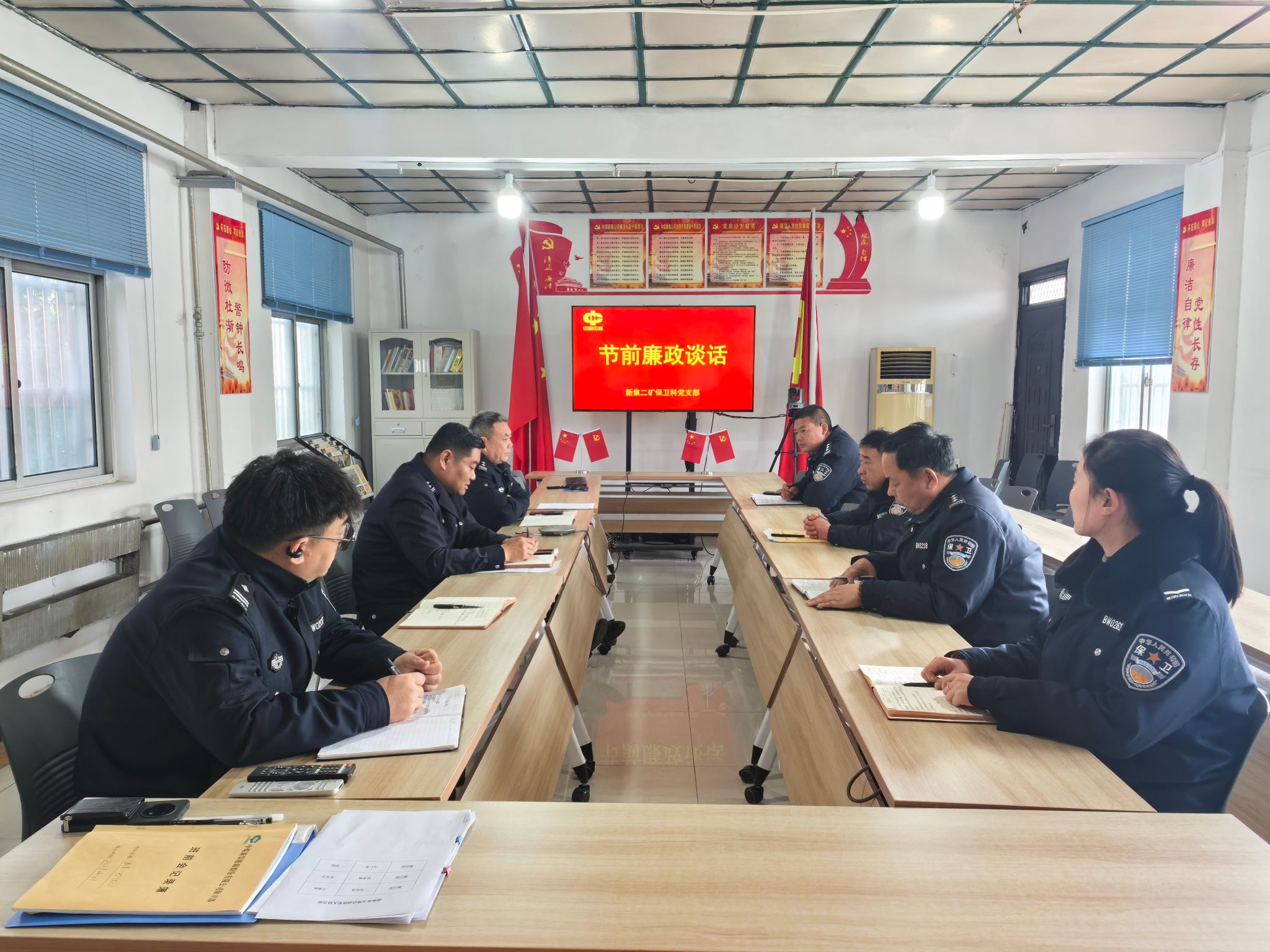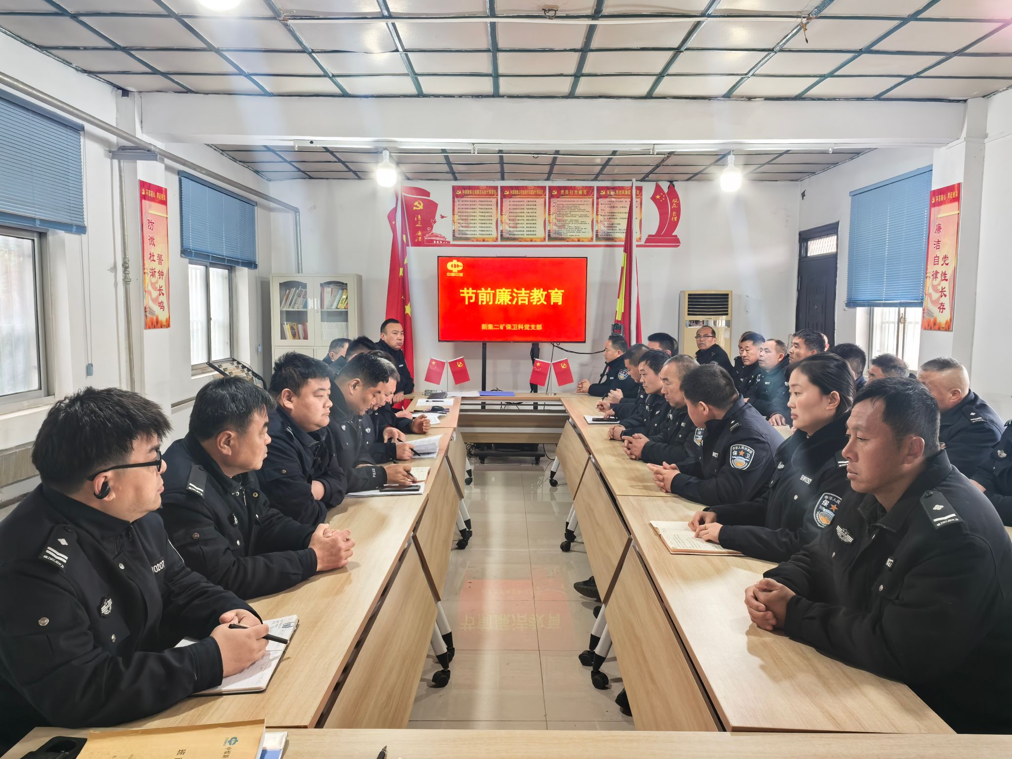 春节来临之际,为切实筑牢廉洁防线,营造风清气正的节日氛围,新集二矿保卫科党支部在党员活动室组织开展节前廉洁谈话与廉政警示教育活动。