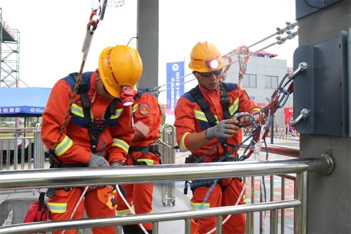聚焦“竖井提升”,竞赛创新背后的实战考量。本届竞赛首次正式将竖井提升纳入团体项目,这一变化源于应急管理部对矿山“多灾种综合应对”的战略布局。该项目模拟井下坍塌后,救援人员需在有限空间通过绳索系统完成伤员转运、设备吊装等任务,全程需在浓烟、噪音等复杂环境下完成,对体能、技能和心理素质提出了极高要求。