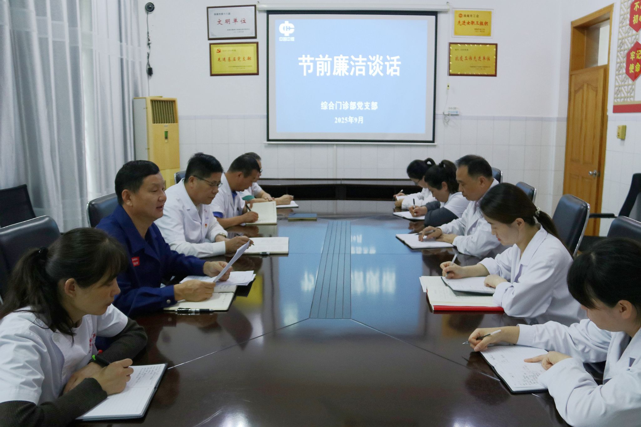 国庆、中秋“两节”将至,为贯彻落实全面从严治党要求,切实加强党风廉政建设,近日,联系点领导新集救护队党委副书记、纪委书记程业帮深入综合门诊部党支部开展节前廉洁谈话,全体党员及入党积极分子参加。