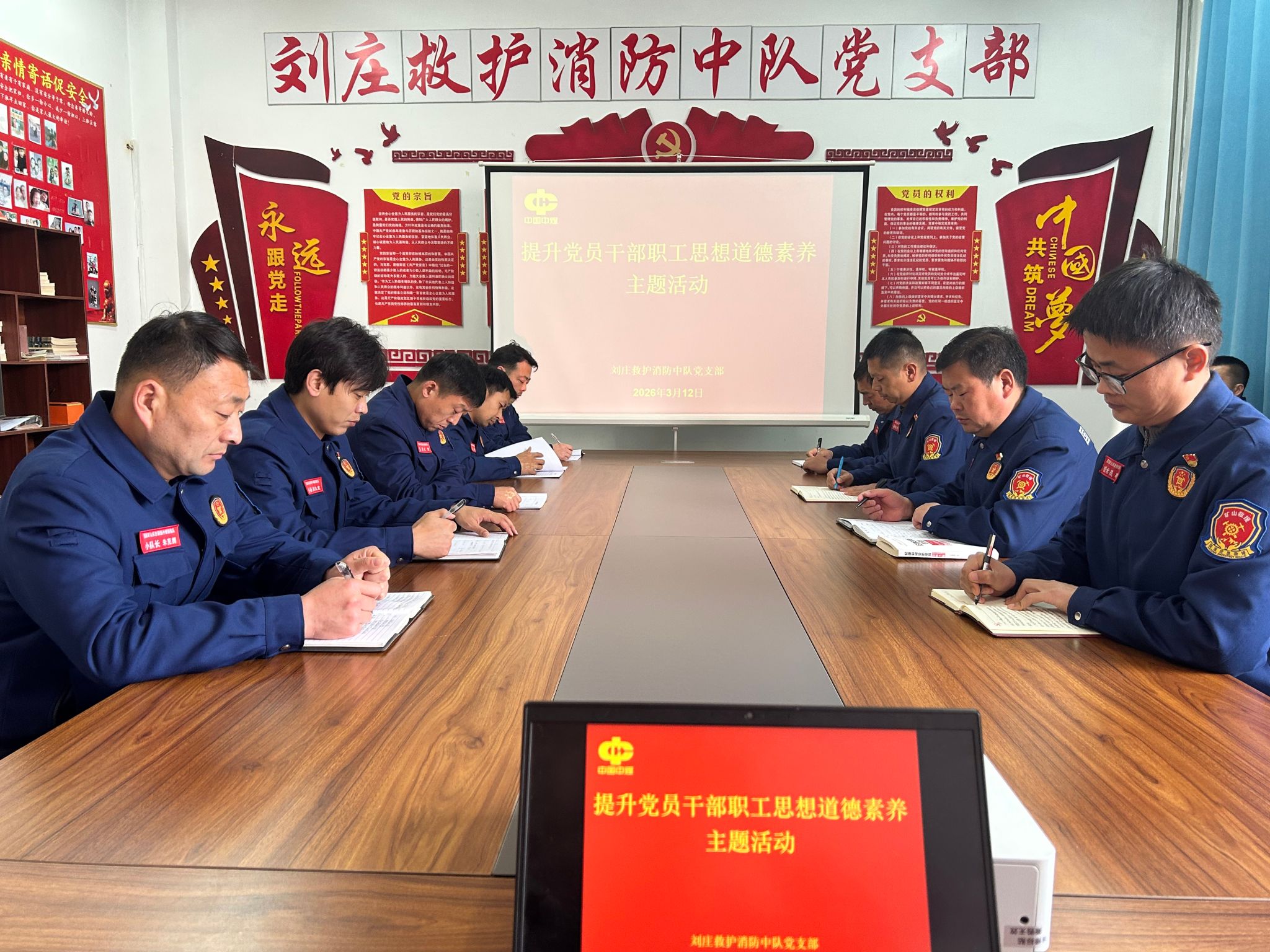 为进一步加强党员干部职工思想道德建设,筑牢队伍思想根基,激发干事创业热情,3月12日,刘庄救护消防中队党支部组织开展“提升党员干部职工思想道德素养”主题活动,中队全体党员干部职工参加学习。
