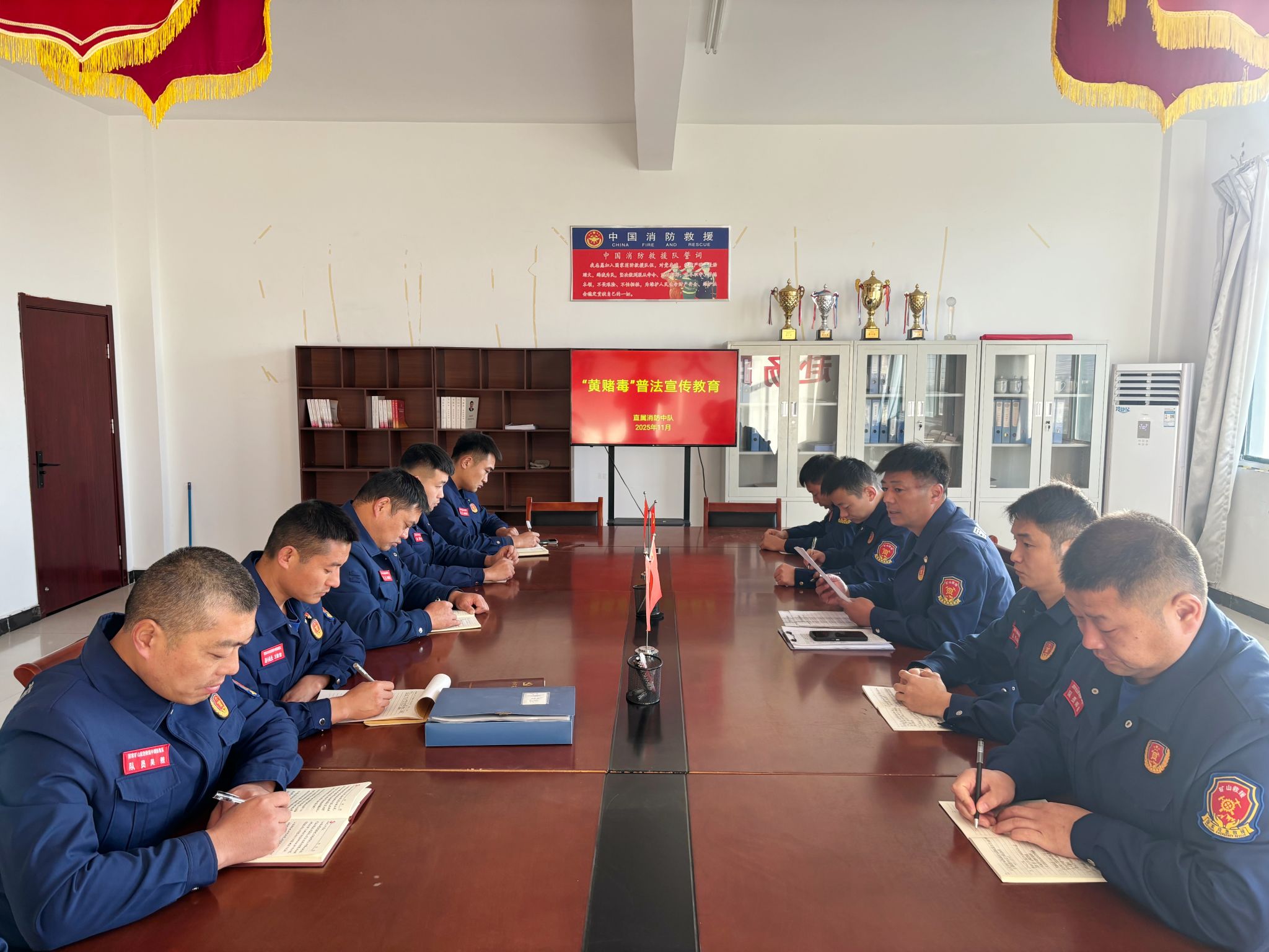 为进一步强化全体指战员法治观念,筑牢抵御“黄赌毒”违法犯罪的思想防线,营造风清气正、文明和谐的队伍氛围,11月25日,新集救护队直属消防中队精心组织开展“黄赌毒”普法宣传教育活动,推动法治教育走深走实。