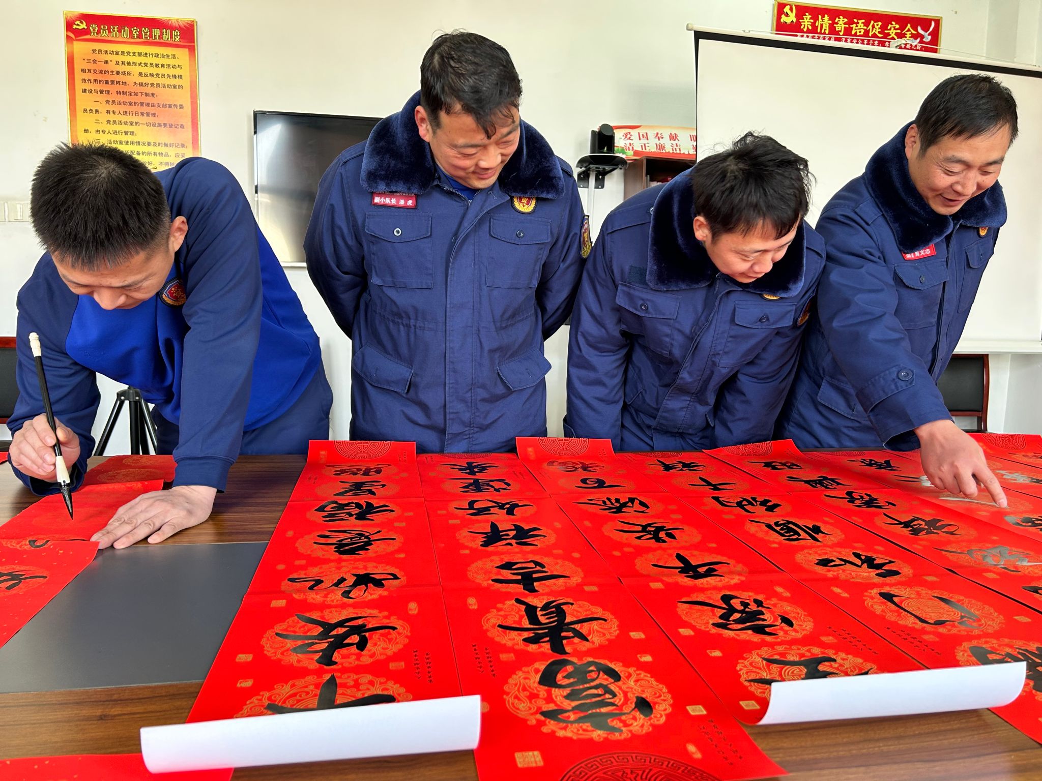 现场暖意融融、墨香四溢,指战员们齐聚党员活动室,铺红纸、研浓墨、挥毛笔,一场热闹非凡的写春联活动正式拉开帷幕。桌上,大红的春联纸整齐铺开,笔墨纸砚一应俱全。桌前,兼具书法功底的指战员们满怀激情,手握毛笔奋笔疾书,将对新年的美好憧憬、对队伍的真挚祝福、对平安的执着守护,悉数融入一撇一捺之中。