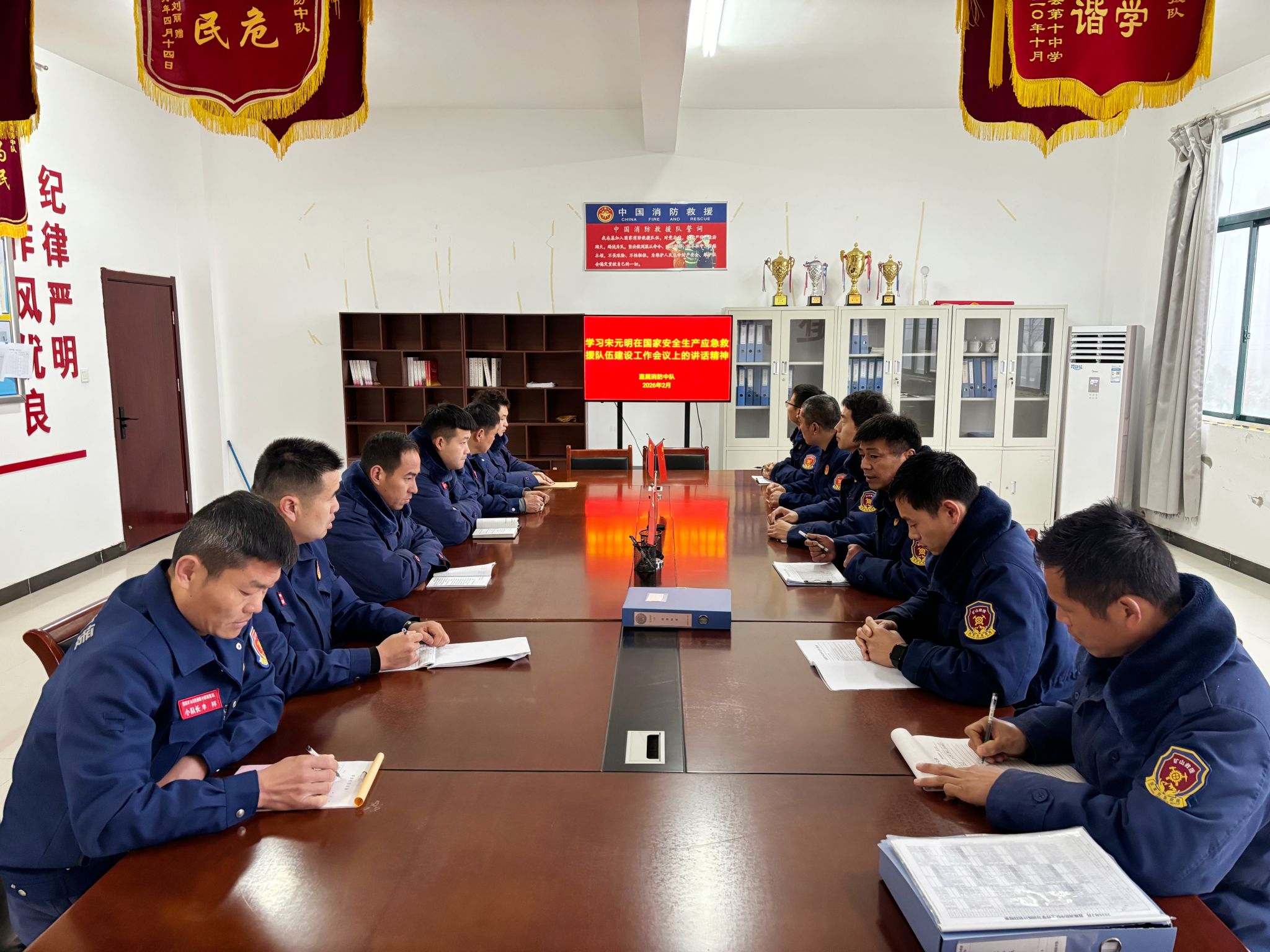 近日,新集救护队直属消防中队组织全体指战员专题学习宋元明同志在国家安全生产应急救援队伍建设工作会议上的讲话精神,通过集中领学、交流研讨等形式,推动讲话精神入脑入心、落地落实,为提升队伍应急救援能力、护航安全生产筑牢思想根基。