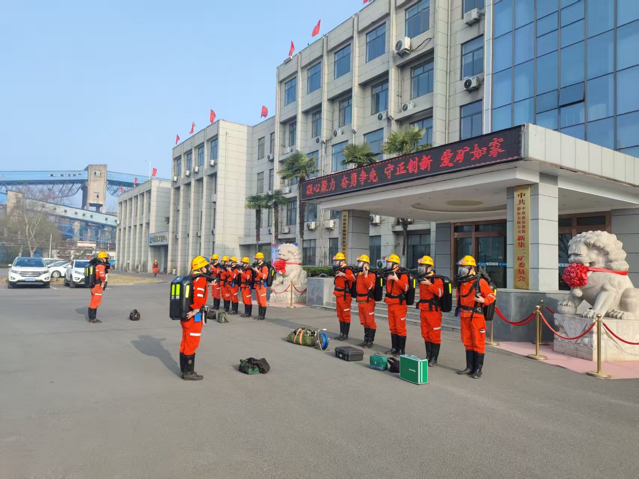 本次演习以230105机巷掘进时发生煤与瓦斯突出事故为背景,开展煤与瓦斯突出事故逃生、救援演习。8时08分中队值班室召请电话响起,电话值班员认真做好记录并立即拉响事故警报。中队指挥员迅速组织两支救援小队紧急出动,带队指挥员到达新集二矿调度室领取救援任务后,立即向救援小队下达救援命令,并强调事故情况、救灾重点、行动路线、安全措施和注意事项,随后带领救援小队按照既定的演习方案开展应急救援,并圆满完成救援任务。