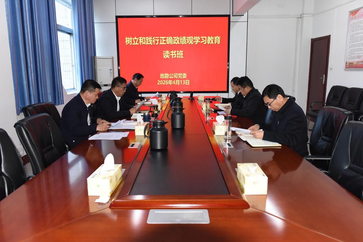 4月13日,地勘公司党委树立和践行正确政绩观学习教育读书班开班,党委书记、副经理桂久军主持会议,党委副书记、经理洪训胜等班子成员参加读书学习。