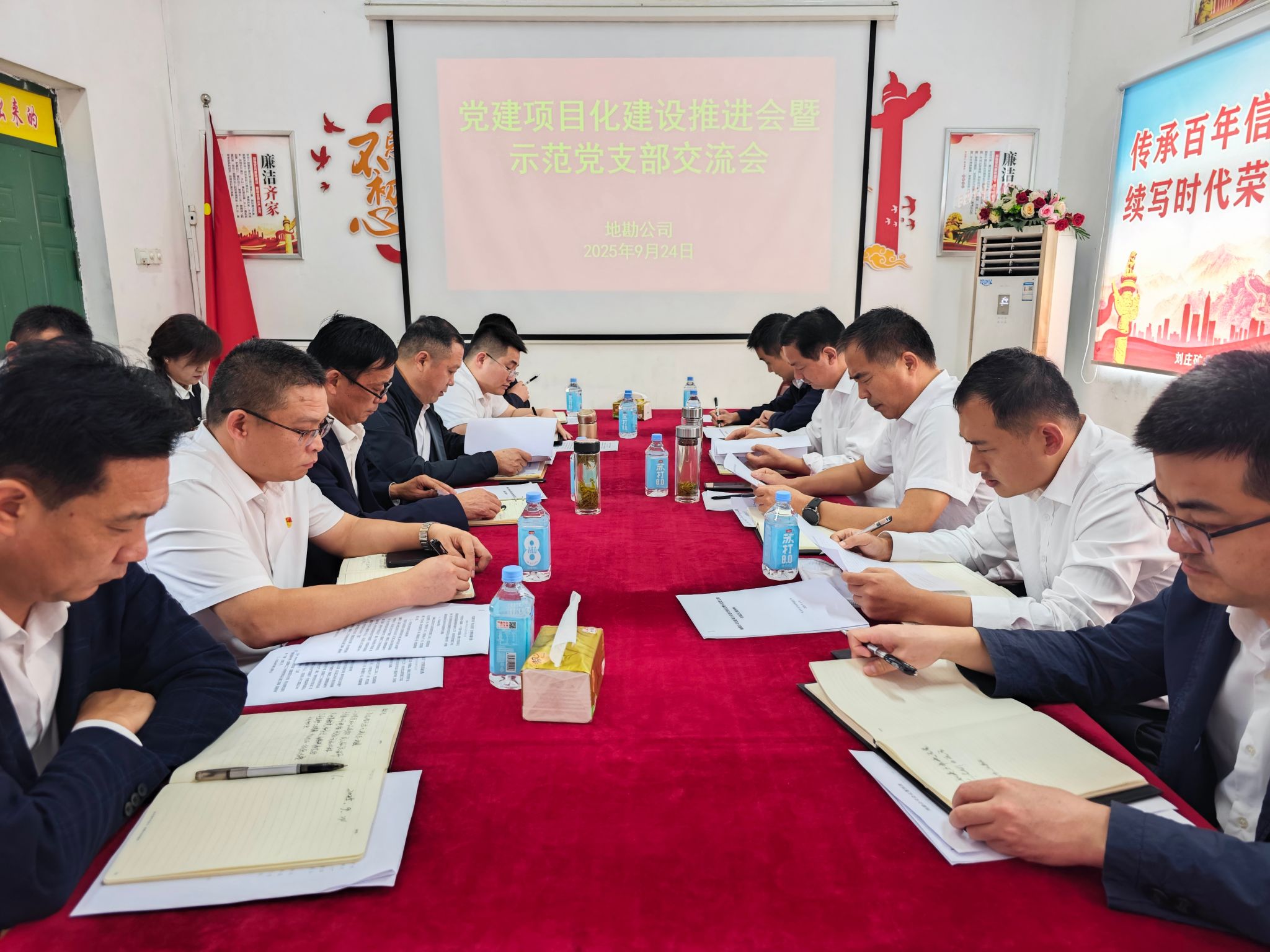 9月24日,地勘公司党委在刘庄矿业项目部党支部召开党建项目化建设推进会暨示范党支部交流会。推广示范党支部创建经验,进一步推动党建与业务深度融合,发挥党建引领保障作用。党委书记、副经理桂久军主持会议,党委副书记、纪委书记李传勇、党建工作科全体,各党支部书记及相关党务工作人员参加。