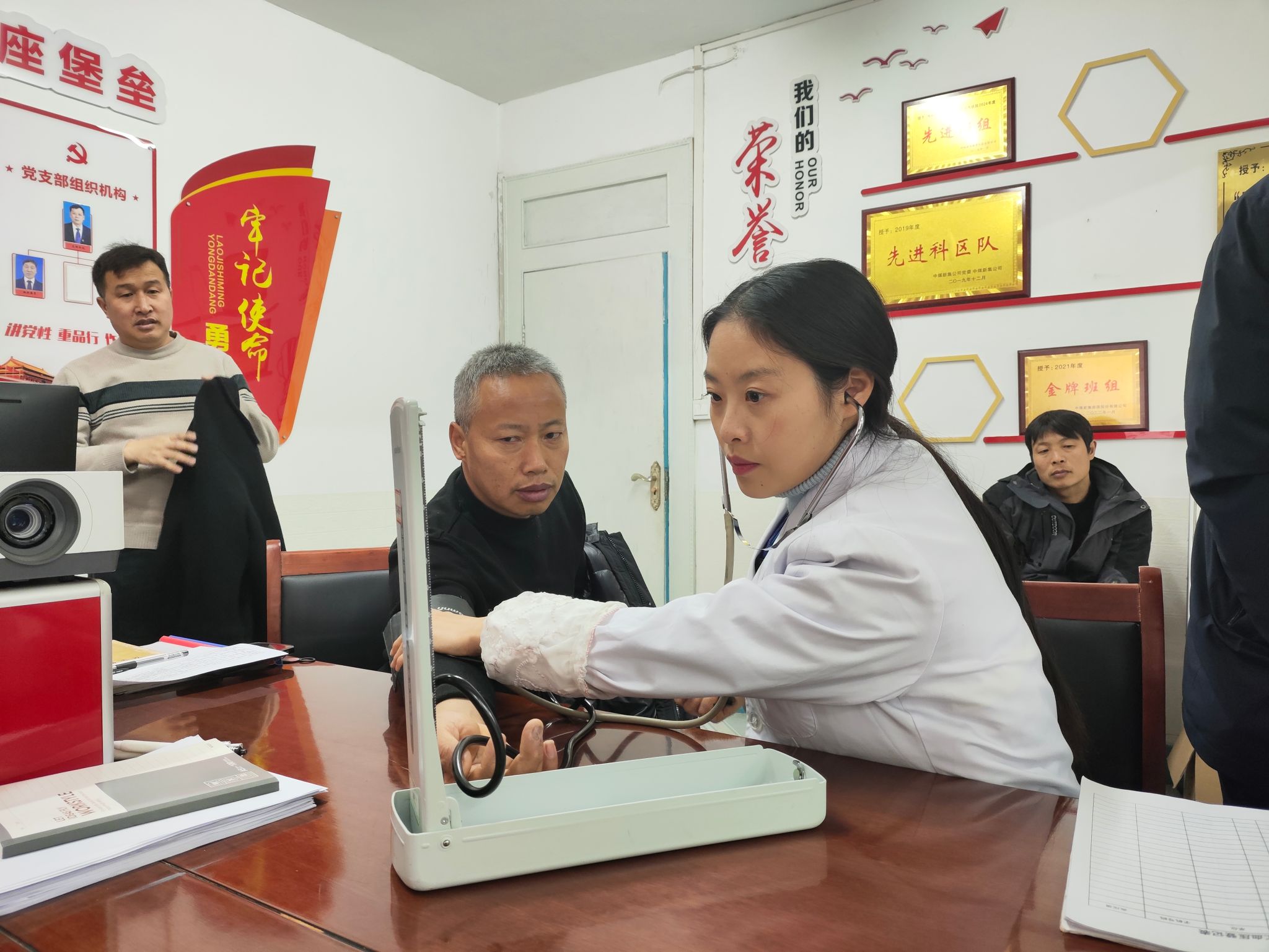 现场手把手教学中,职工们主动上手练习,医护人员则在一旁纠正按压姿势、吹气方式等误区,确保每一位参与者从“听得懂”到“做得对”,真正具备现场急救的基础能力。培训结束后,保健站医务人员热情地为职工测量血压、检测血糖,并详细记录数据。对于筛查出的指标异常人员,进行针对性健康指导,耐心解读异常指标的潜在风险与日常生活注意事项,引导职工树立“防胜于治”的健康理念。