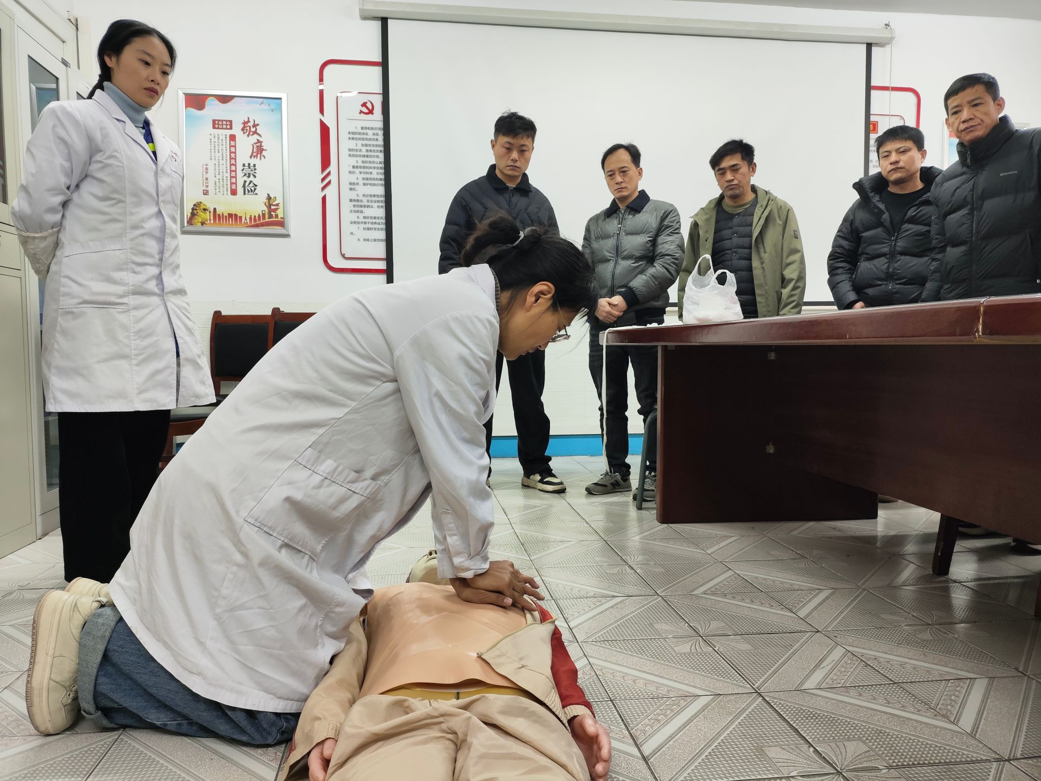 培训现场,保健站的医护人员将枯燥的理论讲解转化为生动的实操演示,利用模拟人教具,向职工们演示了“环境评估——判断意识——呼救求援——胸外按压——开放气道——人工呼吸”的CPR全套流程,深入浅出地讲解了每一步的操作要点、注意事项以及在井下等特殊环境下的应变技巧。