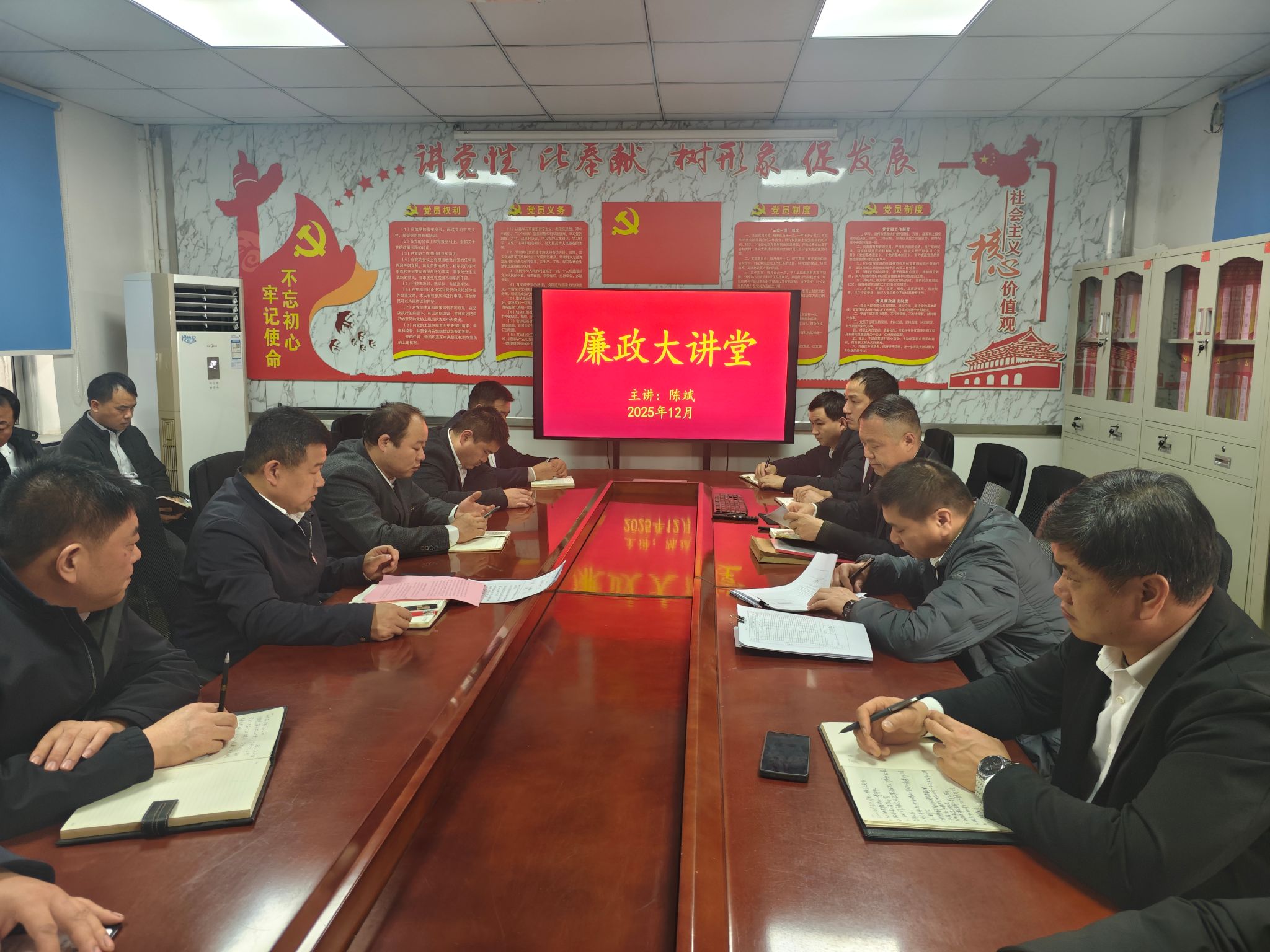 12月11日,地勘公司联系点领导到二矿项目部党支部开展“廉政大讲堂”教育活动,旨在进一步压实党风廉政建设责任,增强党员干部廉洁自律意识,支部党员、技管人员参加。