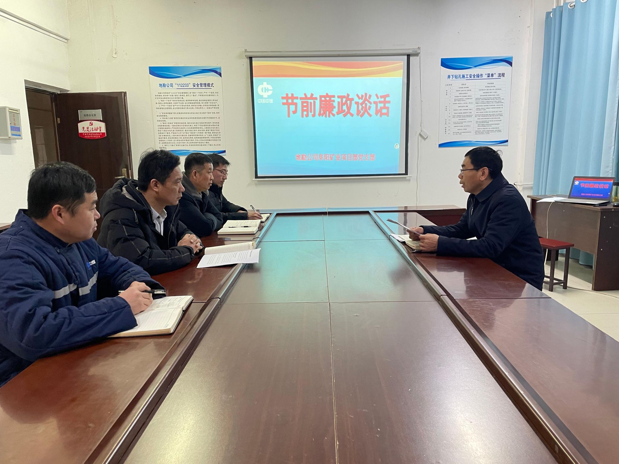 12月25日,地勘公司联系点领导到阜阳矿业项目部党支部,组织开展集体廉政谈话活动,为党支部全体领导干部注射廉洁“预防针”,敲响自律“警示钟”。党支部管技人员、关键岗位人员参加。