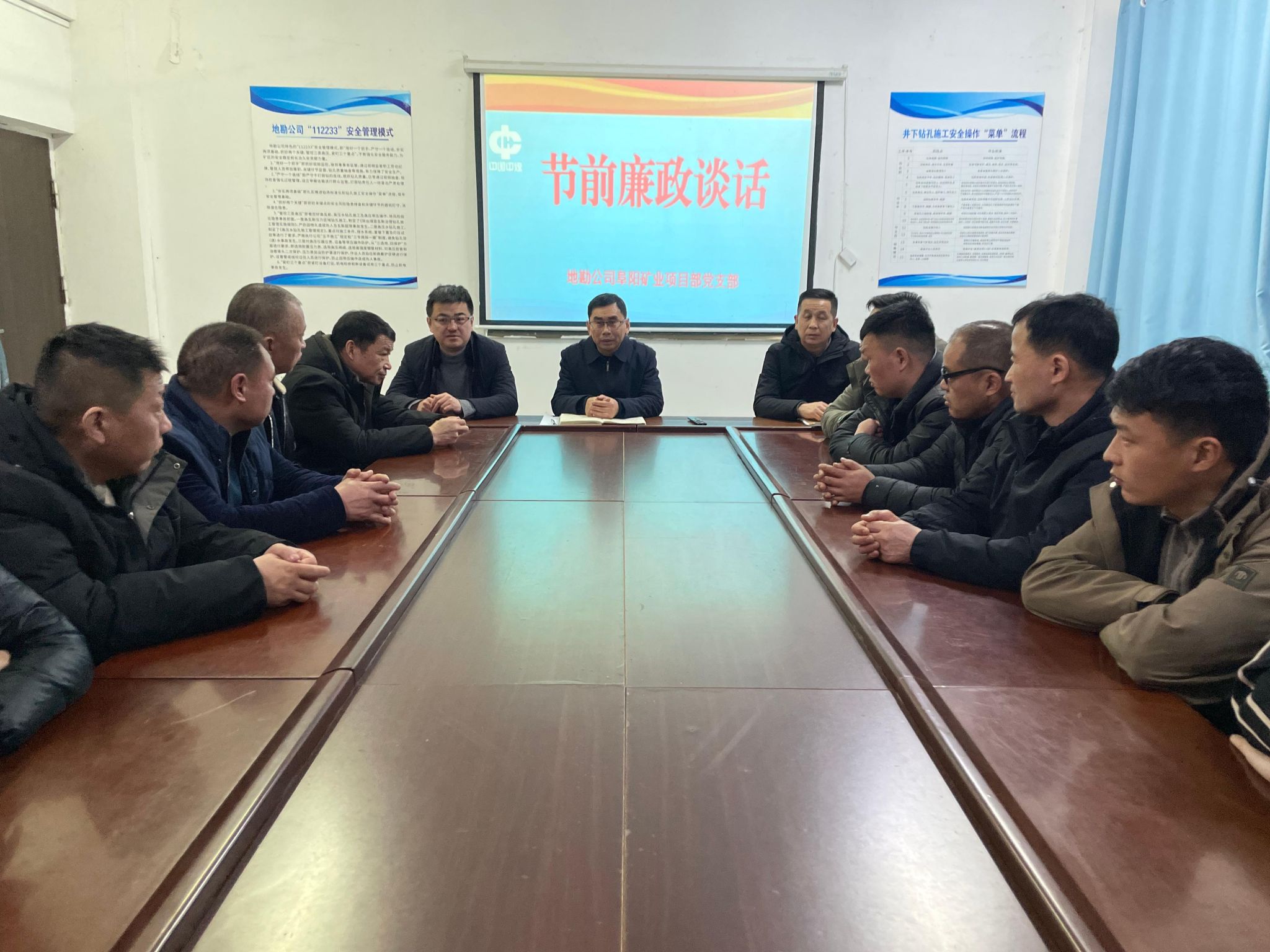 为切实防范节日期间“四风”问题反弹回潮,压紧压实基层党风廉政建设责任。2月13日,地勘公司党建联系点领导到阜阳矿业项目部党支部开展集体廉政谈话,为全体参会人员敲响廉洁过节“警钟”,送上新春廉洁祝福。党支部班子成员、党员干部及关键岗位人员参加。