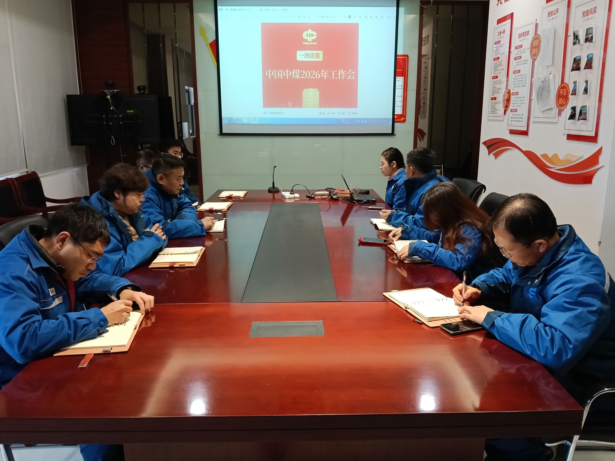 会上,大家集中学习了中煤新集在线发布的图文报道《一图读懂!中国中煤2026年工作会议》。通过学习了解到,在刚刚收官“十四五”征程中,中国中煤面对能源转型浪潮与市场波动挑战,交出了一份厚重提气的成绩单。2025年,在煤炭市场下行压力和绿色低碳转型攻坚任务面前,集团党委坚决贯彻党中央、国务院决策部署,坚持以“存量提效、增量转型”双轮驱动为核心,深耕“煤—电—化—新”一体化产业链,创新“两个联营+”发展模式,构建“两个对冲”机制,不仅实现经营业绩大幅领先行业平均水平,更高水平完成“十四五”规划目标任务,为建设世界一流能源企业奠定了坚实基础。