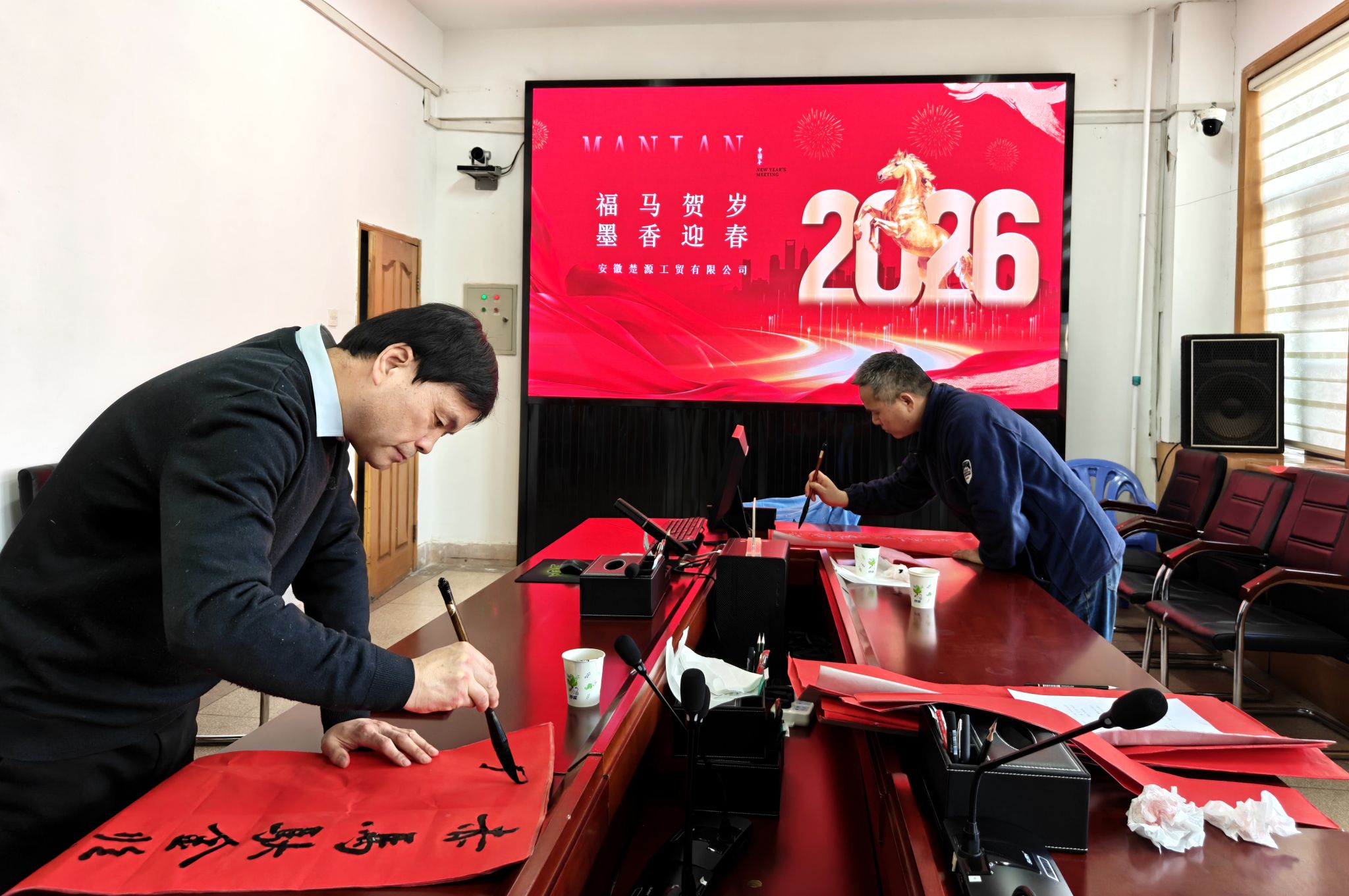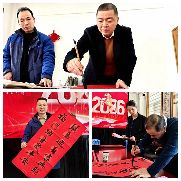 活动当天,楚源公司三楼会议室内红纸铺展,墨香四溢。几位擅长书法的职工挥毫泼墨,笔走龙蛇。“骏马奔腾迎盛世,新春吉祥庆丰年”“一路马蹄花影俏,万家春色柳烟新”……一副副充满吉祥寓意的春联在他们笔下诞生,既有对马年腾飞的美好期许,也饱含对企业发展和同事情谊的真诚祝福。