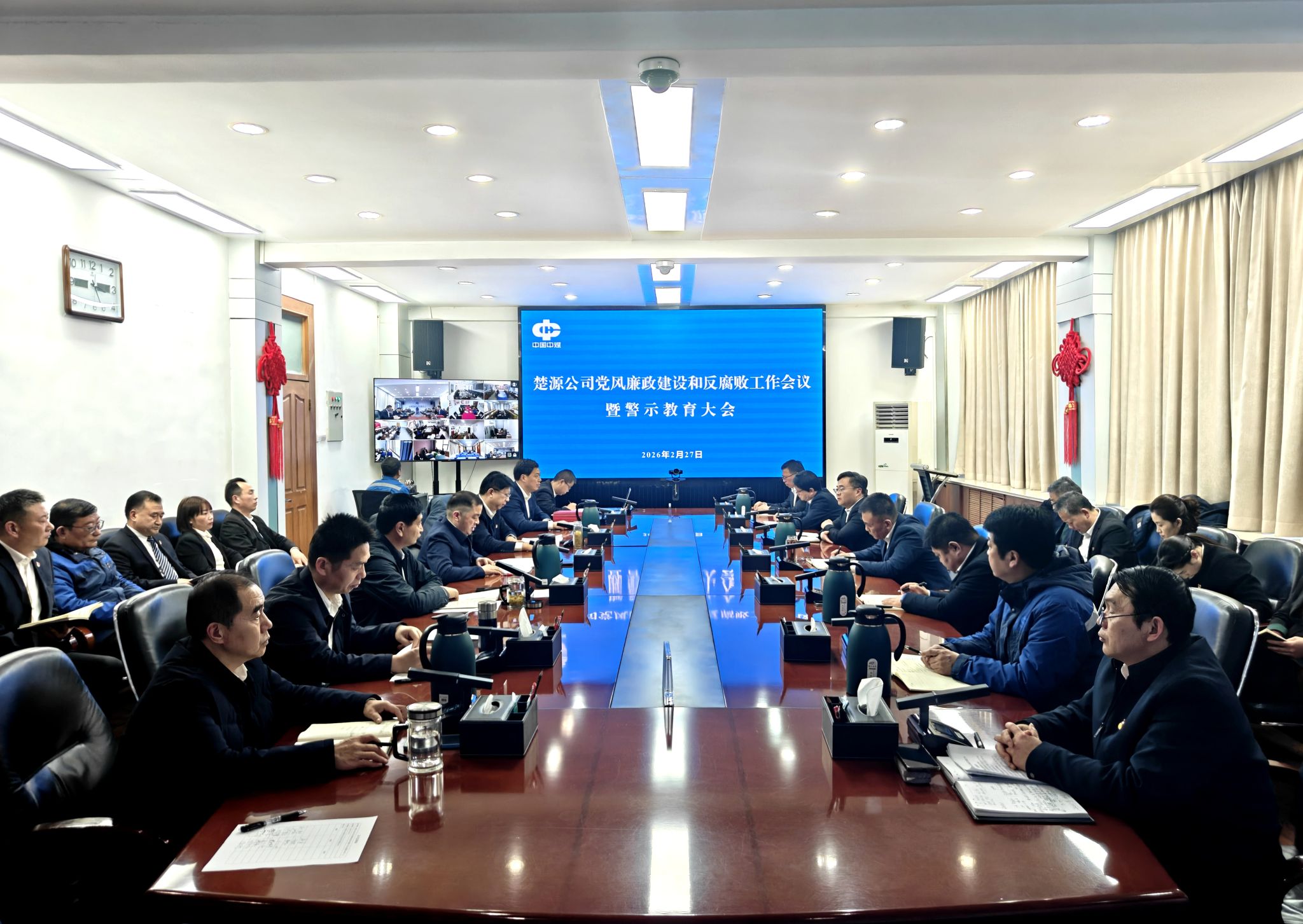 2月27日,楚源公司召开2026年党风廉政建设和反腐败工作会议暨警示教育大会。楚源公司党委书记、董事长陈国民作党风廉政建设和反腐败工作报告,并与所属单位党组织负责人代表签订《党风廉政建设责任书》。党委副书记、总经理孔令武主持会议并传达集团公司和新集公司会议精神。党委委员、副总经理程晋江传达新集公司关于违纪违法典型案件和落实巡察整改不力典型问题的通报。
