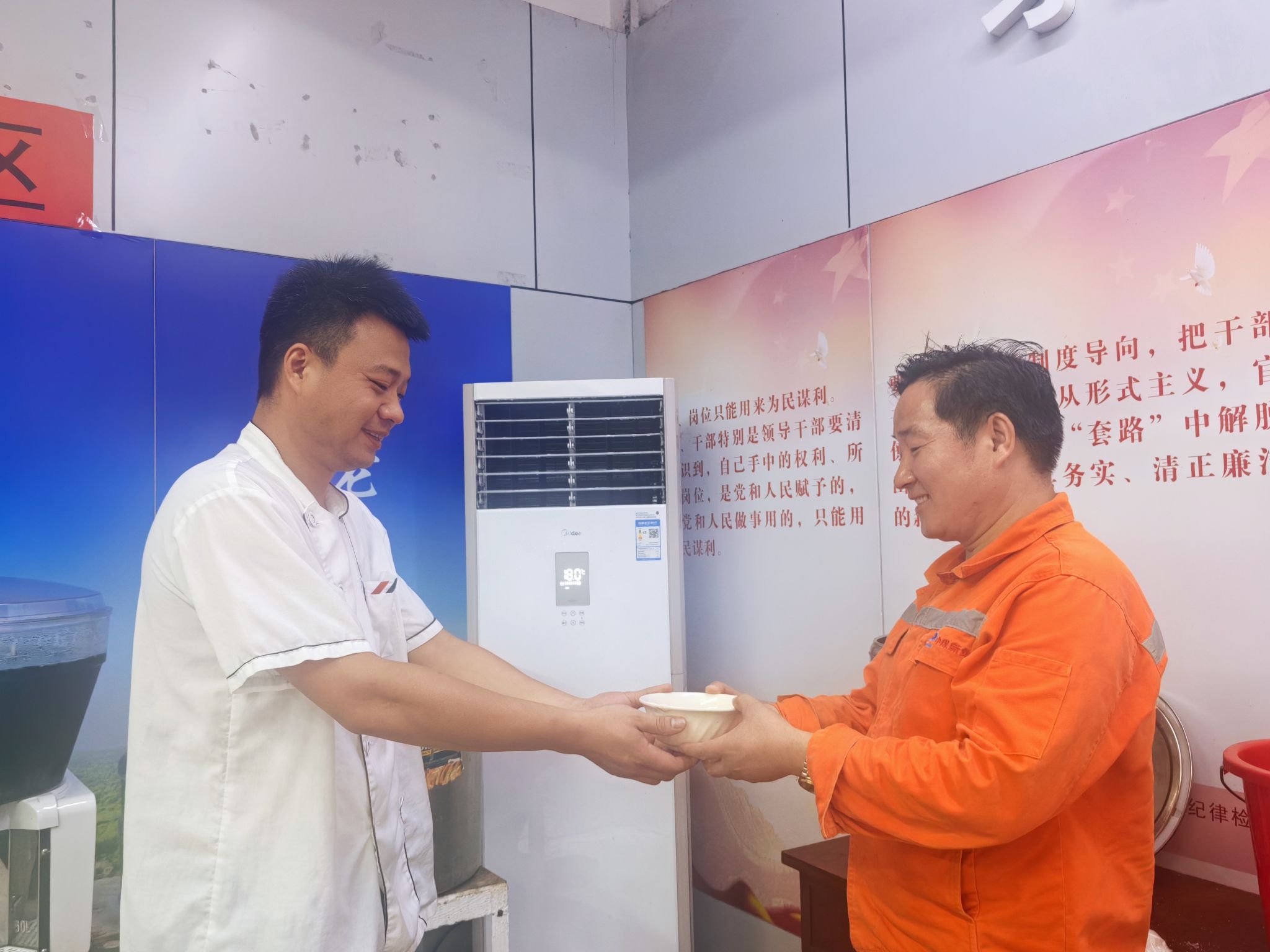 为了入井、升井的矿工兄弟在每日高温时间段能喝上新鲜的绿豆汤,食堂工作人员每日上午9点准时将烧好的绿豆汤从职工食堂送至井口,并在井口为上、下班工友送上一碗可口而温度适中的绿豆汤,同时叮嘱矿工兄弟注意安全,工作期间思想不可麻痹,并鼓励大家战胜高温、确保安全生产。