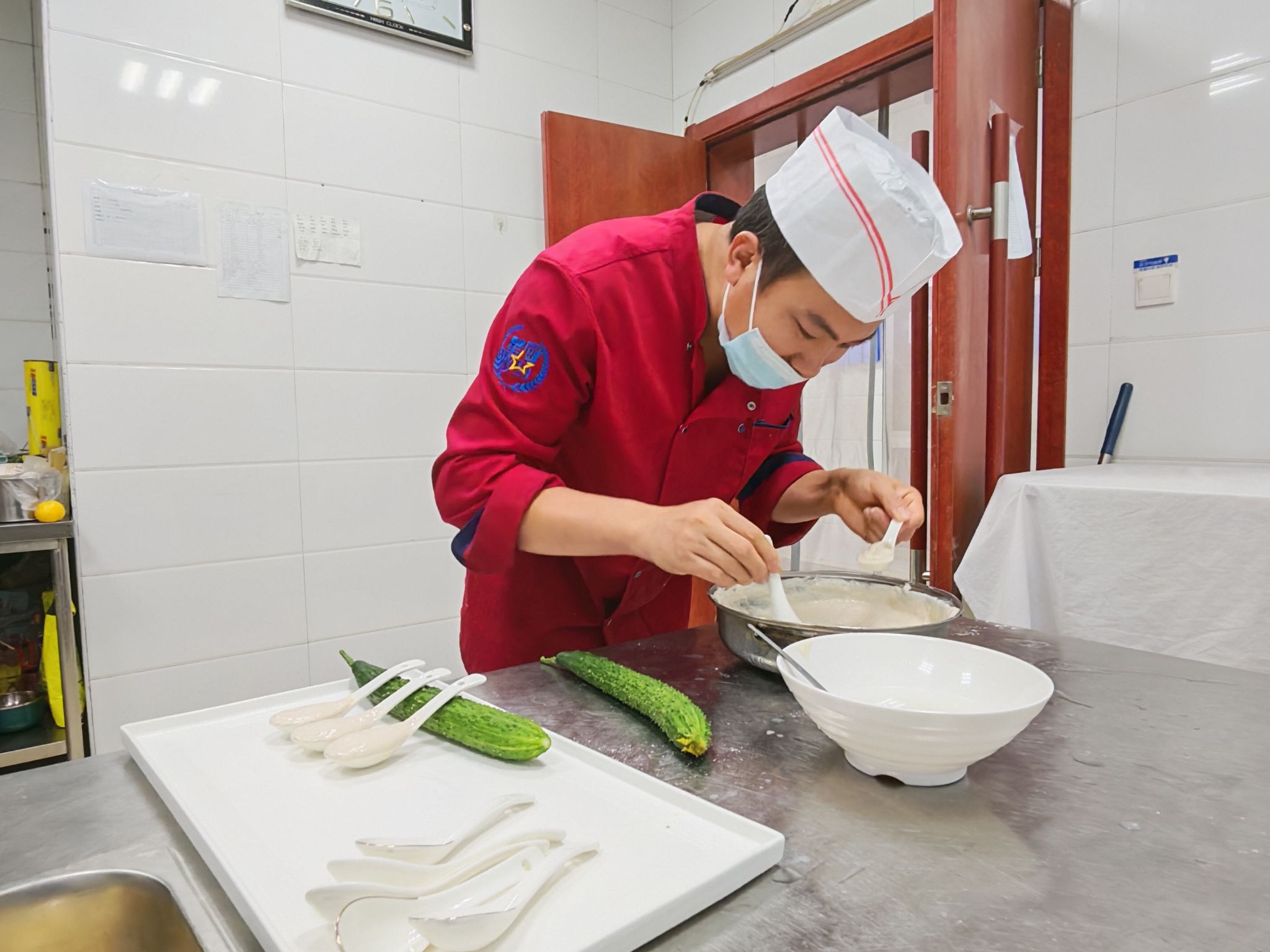 炉火纯青,烹制美味佳肴。中式烹饪师叶雷雷,他有着丰富的烹饪经验和精湛的厨艺,就像一位指挥家,有条不紊地指挥着各种食材在锅中翻滚跳跃,他熟练地掌握着火候,适时地加入调料,每一道菜在他的手中都能变成一件艺术品。为了准备这次竞赛,他精心研究菜谱,反复试验烹饪方法。选用新鲜的食材,注重菜品的营养搭配和口感层次,每一道菜都倾注了他的心血和智慧。