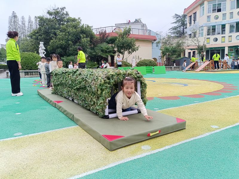 为了让国防教育更接地气,幼儿园还设置了趣味军事体验活动。老师们为孩子搭建专属“军事训练场”,模拟军人的训练场景。孩子们在老师的指引下“翻雪山”“过草地”“走独木桥”…在亲身体验中,感受军人的勇敢与坚强,培养幼儿不惧困难、勇往直前的良好品质。此外,该园还组织师生共同观看《南京照相馆》爱国主义影片,将爱国情怀培育与国防意识提升深度融合,筑牢全员的国防观念。