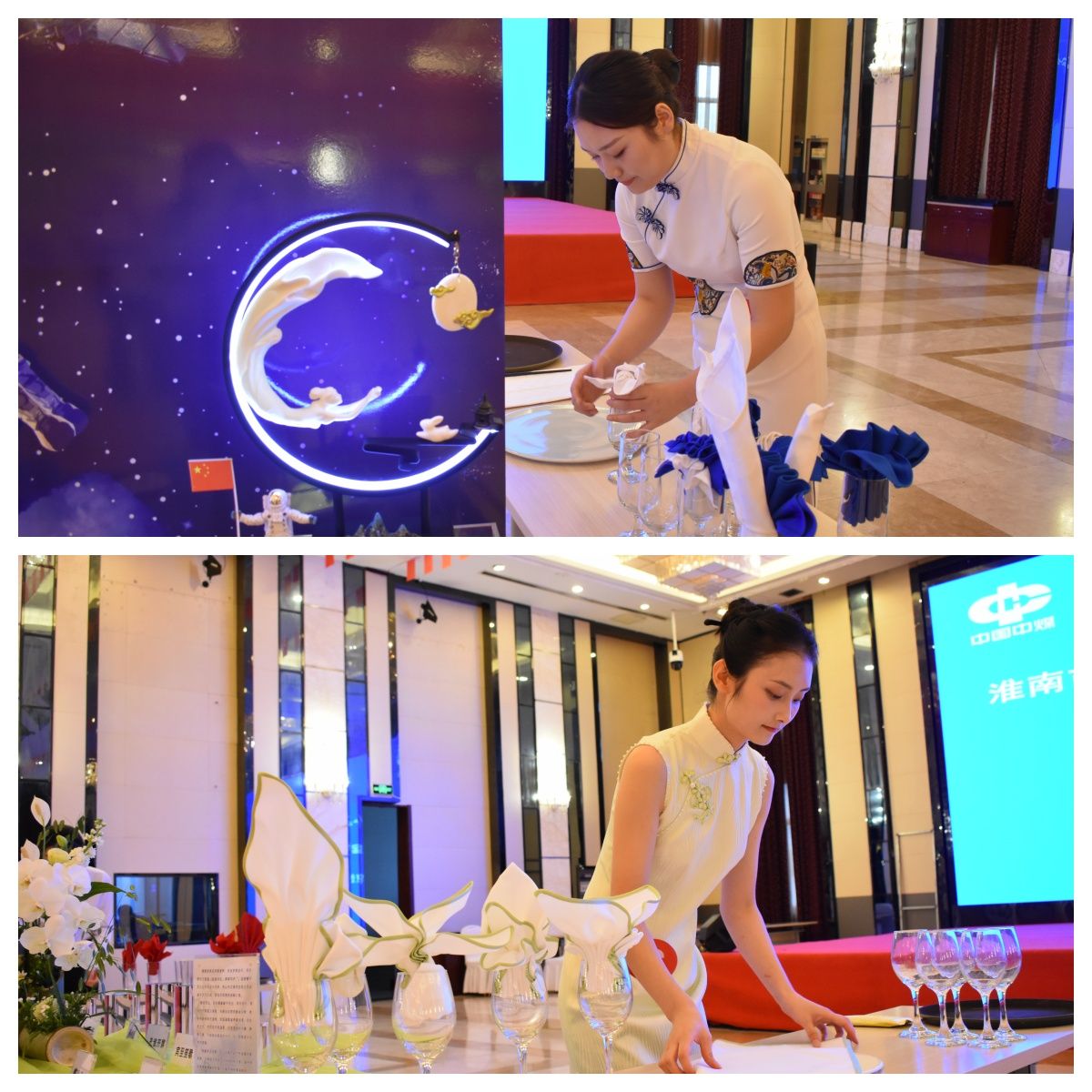 本次餐厅服务实操比赛为中餐宴会摆台和主题餐巾折花项目。大赛以中餐主题宴会设计为主线,涵盖了台面创意设计、宴会摆台、菜单设计等内容。大赛开始后,参赛选手们手持托盘稳步行进,杯盏之间无一丝晃动。餐巾在指尖绽放成百合花、白天鹅的模样,瞬间增添了餐桌仪式感。在主题摆放、餐具定位、斟酒服务等环节规范有序,展现了中餐宴会摆台的艺术美感与礼仪风范。在主题折花环节,将折花和艺术创作融合在一起,折出十种不同贴合主题的杯花,营造主题氛围。赛场内,选手们动作流畅、语言优美,优雅平衡间藏着服务与技能的双重较量,尽显餐饮服务的温度与品质,展现出扎实的餐饮服务功底和创新能力。