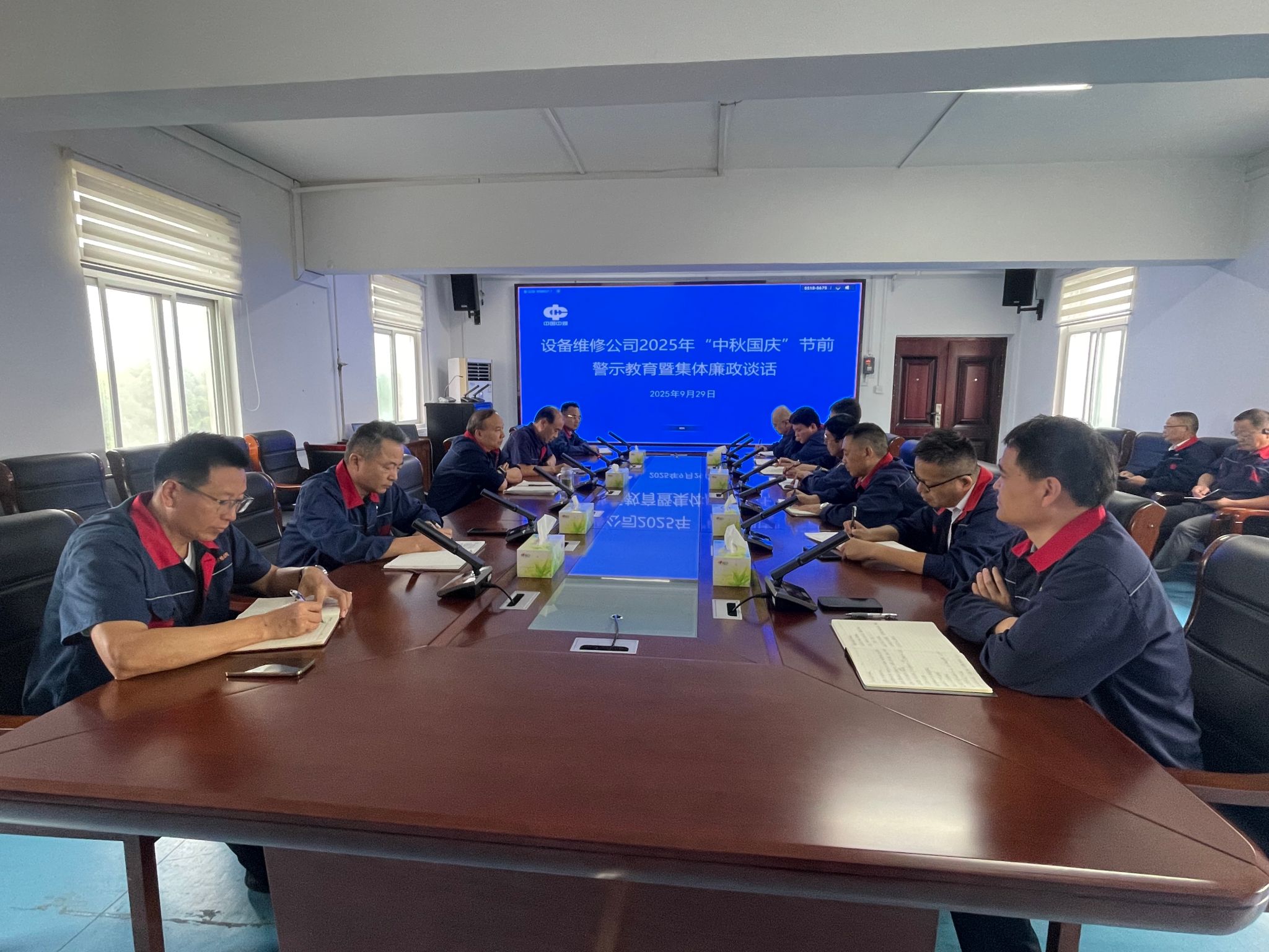 9月29日,设备维修公司开展了“中秋国庆”节前警示教育暨集体廉政谈话,该公司领导班子成员、副主管以上管理人员参加。