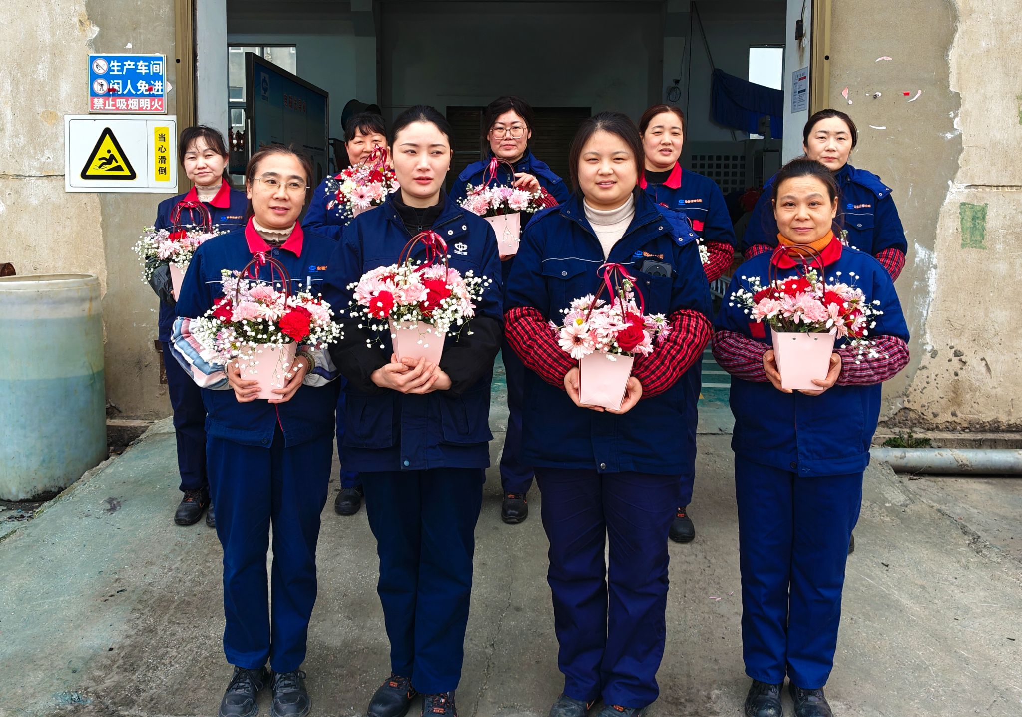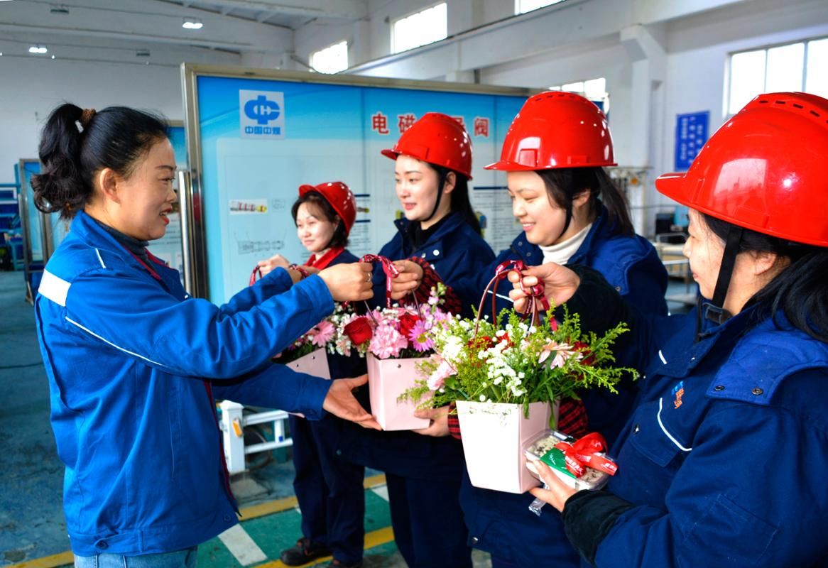 在电液控阀检修厂房,女职工们收到鲜花后,兴奋地拿出手机合影留念,并将这些温馨浪漫的瞬间发到自己的朋友圈上,向家人和朋友分享节日的喜悦。
