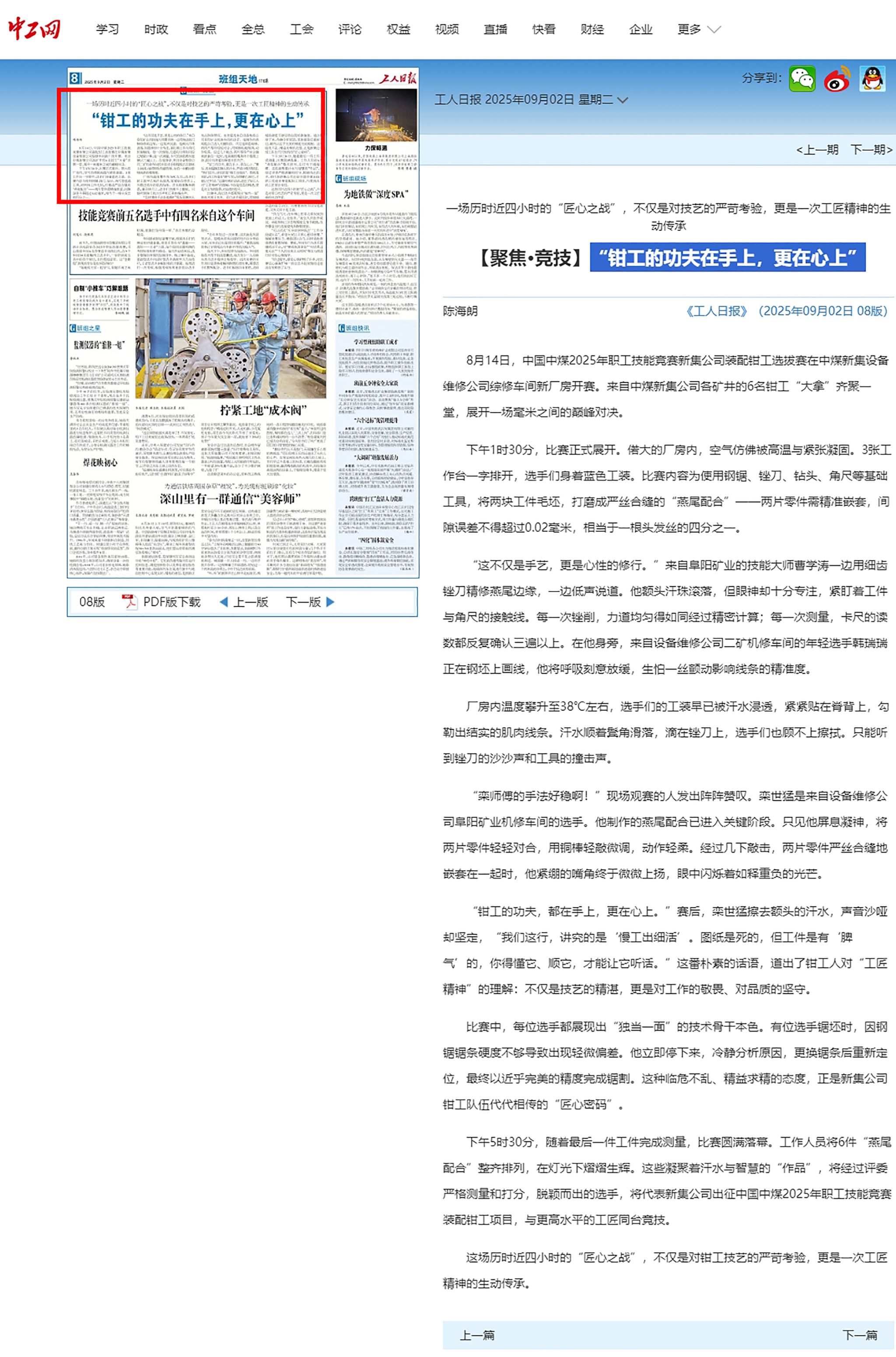 8月14日,中国中煤2025年职工技能竞赛新集公司装配钳工选拔赛在中煤新集设备维修公司综修车间新厂房开赛。来自中煤新集公司各矿井的6名钳工“大拿”齐聚一堂,展开一场毫米之间的巅峰对决。