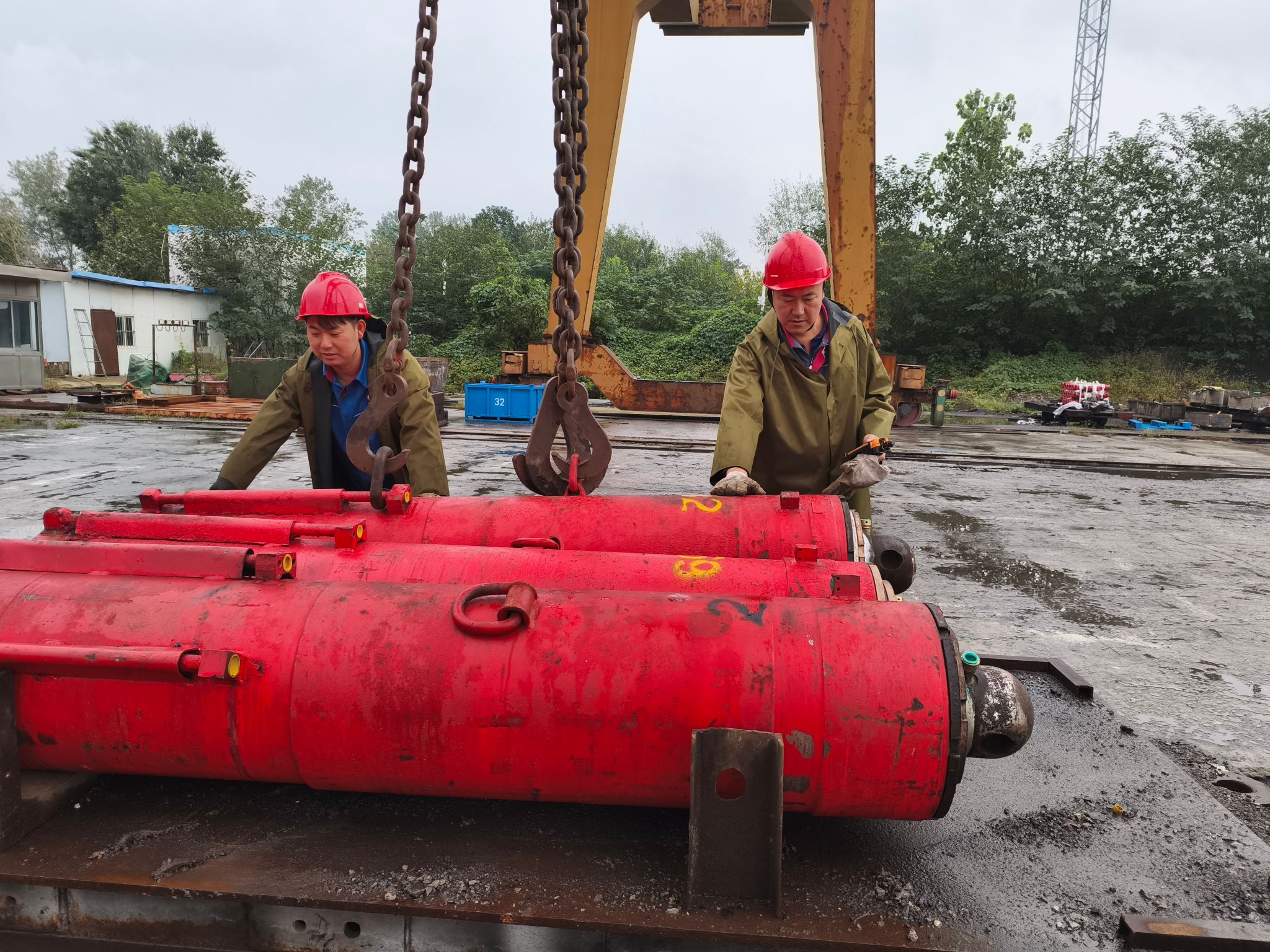 在检修西场地北侧,一台台检修完毕的ZZ13000型液压支架如整装待发的钢铁军团,在冷雨中威武排列。这些承载着矿井高效开采重任的“大家伙”,凝聚着检修职工的匠心。作业人员赵健与黄傲正在行车操作区全神贯注地作业:他们要将沉重的支架掩护梁精准吊装至平板车上。寒风卷着冷雨打在脸上,针刺般疼,尽管防护手套完全护住了双手,但液压支架的冰寒仍透过橡胶层直抵掌心,不一会儿手指便冻得失去知觉。“起吊高度0.3米、偏西、稳一点……”黄傲的声音在风里有些发颤,却带着不容置疑的坚定。当掩护梁最终平稳落至平板车的那一刻,两人冻得冰冷的脸上才露出一丝释然,而这样的起吊、转移、落定,他们在当天要重复几十次。