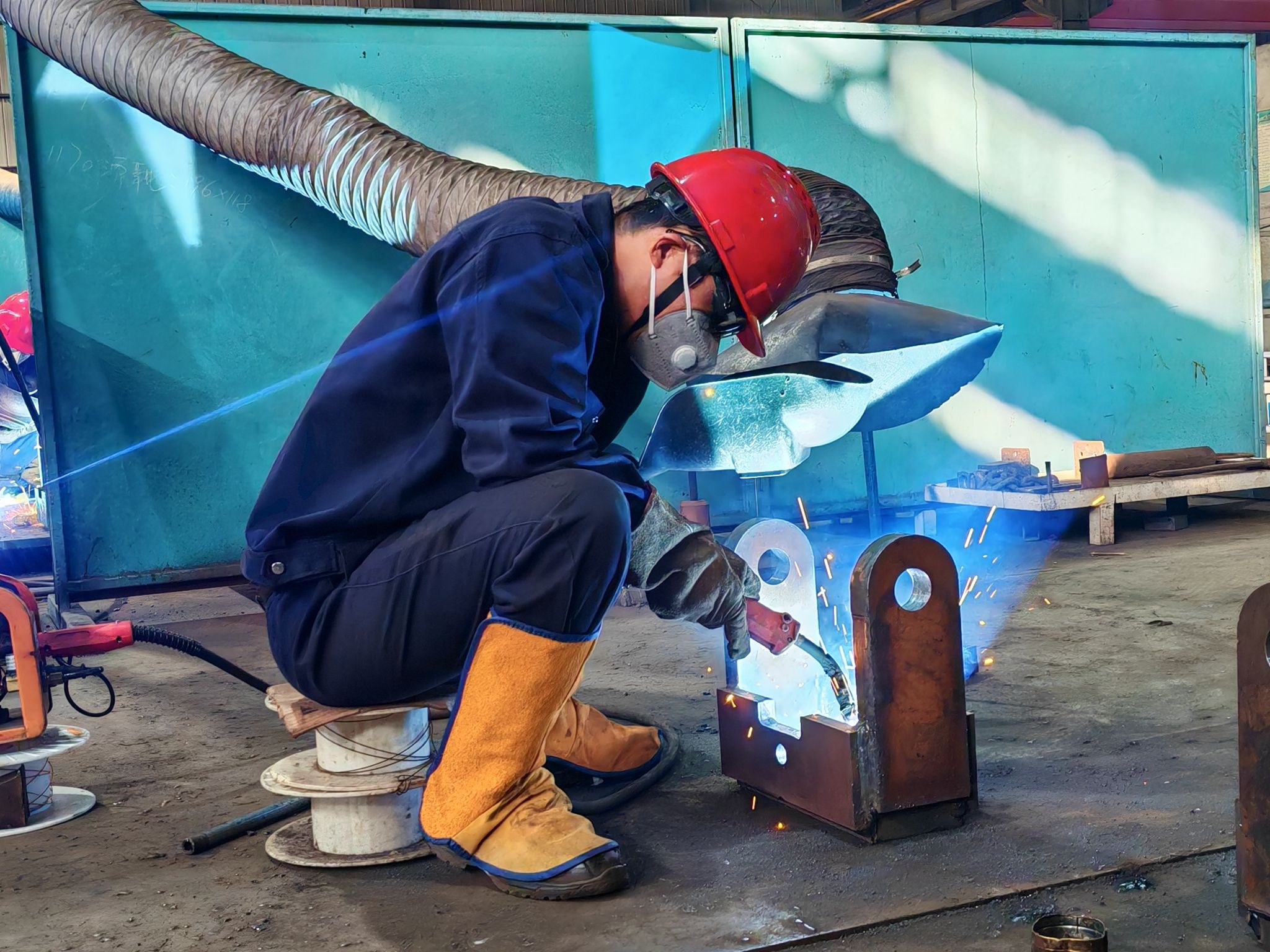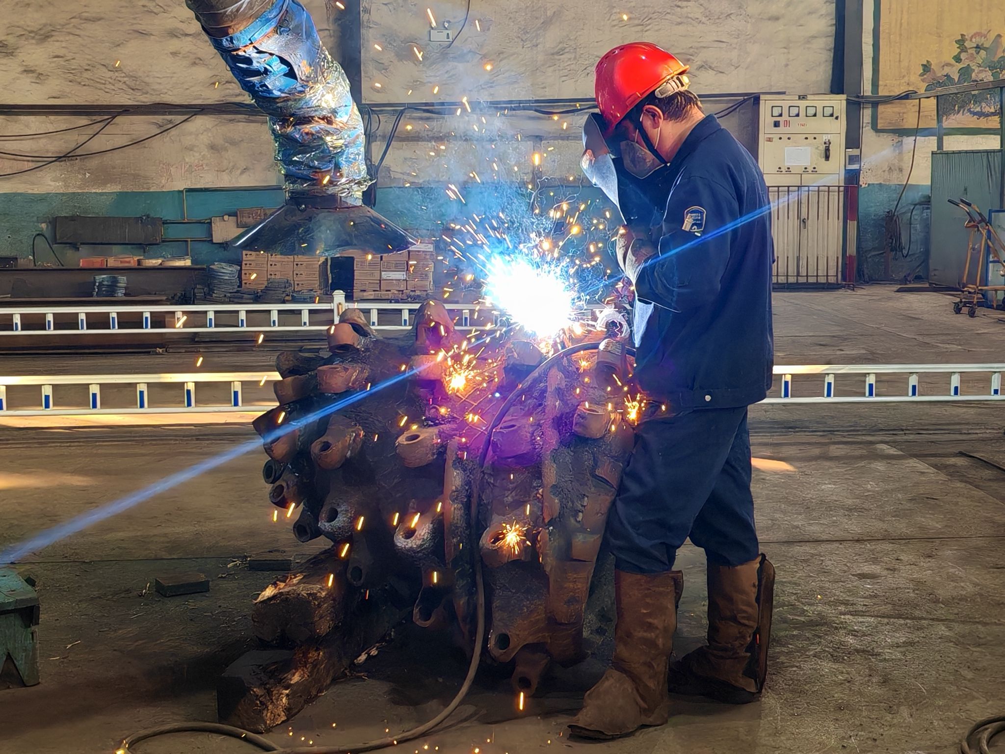 焊工师傅老刘正手持焊枪,蓝色的焊花在金属构件上绽放,如同夜空中的星火。他戴着防护面罩,身体微微前倾,焊枪的喷嘴精准对准焊接点,熔化的金属液顺着焊缝流淌。火花溅落在他的工装上,留下点点烫痕。