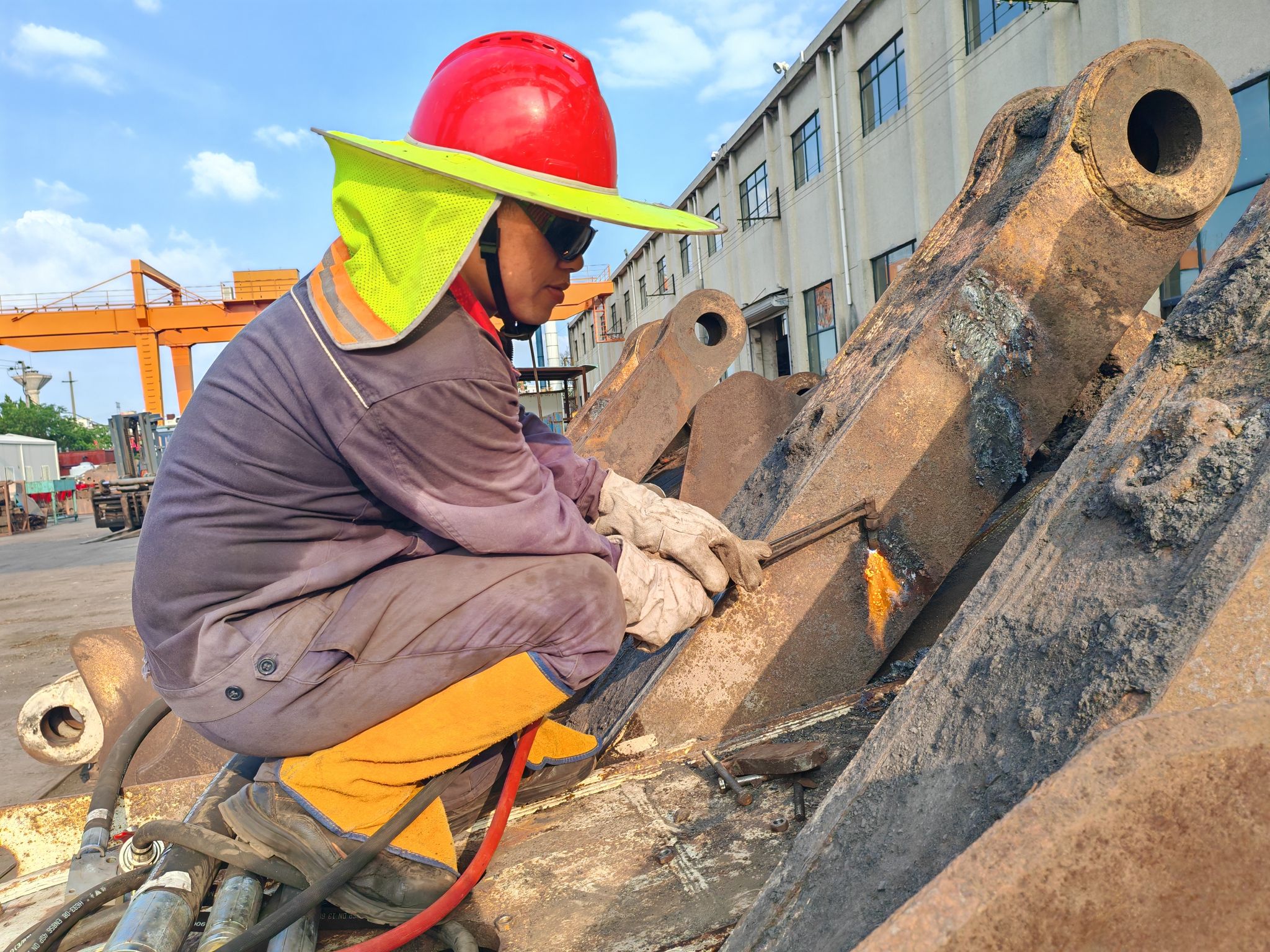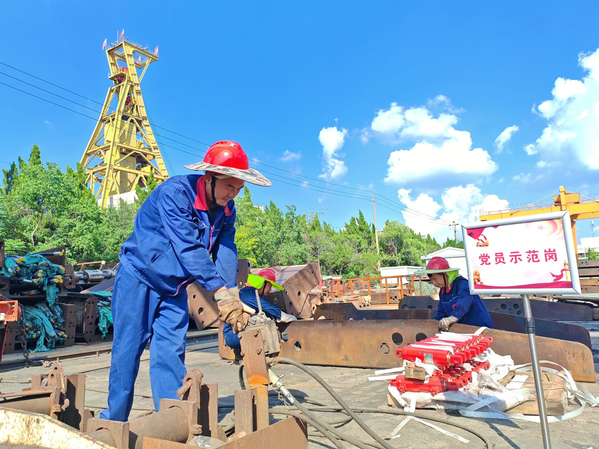 支架班职工们穿戴好工作服,按照规定流程召开完班前会。大家带着检修工具走向各自作业场地。安全帽下,因长期室外作业晒成的古铜色脸庞很快就挂满了汗珠。为抵御紫外线灼伤皮肤,他们用长袖工装裹住手臂,在安全帽边缘加上防晒挡板来减少烈日的炙烤。上午十点钟,当气温逐渐攀升至三十七八度,地表温度就已经超过四十度。支架组装进入关键阶段,因为是大部件起吊和组装作业,需要团队合作才好完成,职工们没有因为高温而停止设备组装,大家协调配合,认真细致地完成ZZ7600支架侧护板、顶梁、油缸、销轴等组装。他们手中的扳手、锤子和撬棍等工具从未停歇过,起重机的起吊声、号子声和阵阵热浪交织一起,奏出一曲和谐的“交响曲”。