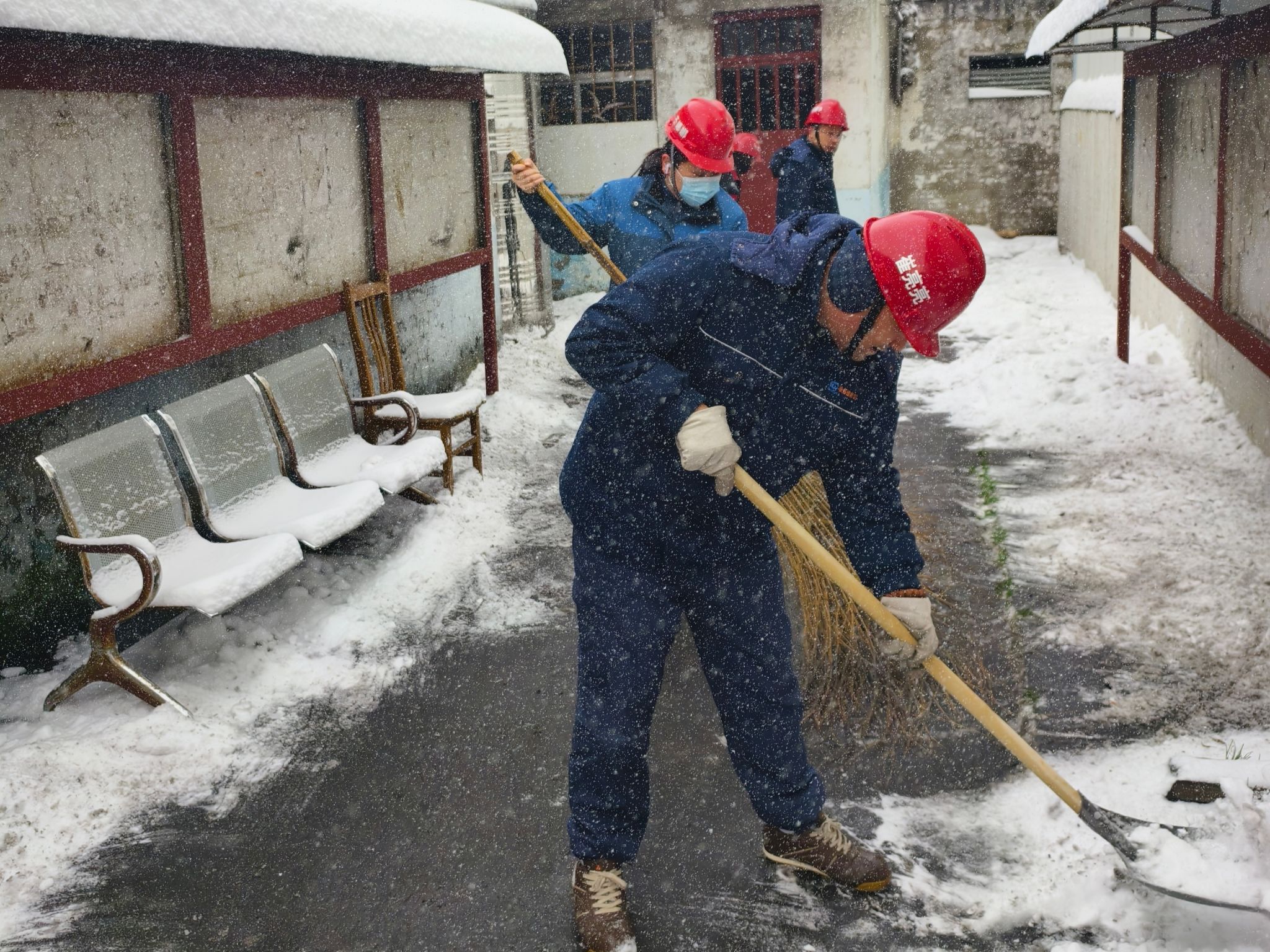 扫雪现场呈现出一派繁忙有序的景象。职工们手持扫帚、铁锹等工具,不畏严寒,齐心协力。有的职工用力挥动铁锹,将积雪一锹锹地铲到路边;有的职工则拿着扫帚,仔细地将残雪清扫干净;经验丰富的老员工指导年轻职工如何更省力地完成扫雪任务。协安员、群监员和青安岗员更是身先士卒,穿梭在各个区域,不仅参与扫雪,还时刻监督现场的安全,提醒大家注意防滑、防止过度劳累。