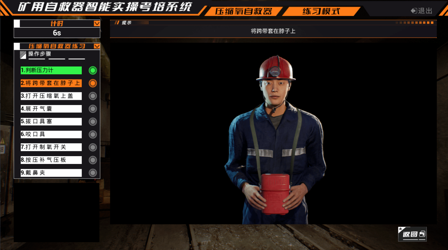 “纸上得来终觉浅,绝知此事要躬行”。实操训练作为本次培训的核心环节,在教师指导下,班组长们借助矿用自救器智能实操培训系统,开展了反复模拟演练。训练严格对标《煤矿安全规程》及自救器使用规范,内容涵盖从迅速取出自救器、扳动开启扳手、破除封印、摘除上外壳、展开气囊、正确佩戴口具、咬紧牙垫、夹好鼻夹,直至均匀呼吸并系好头带的全流程操作教师对每一步的动作要领、操作节奏、易错环节进行了细致指导和纠正,确保操作的规范、熟练。训练现场气氛严肃而积极,班组长们相互观摩、交流心得,形成了“比、学、赶、帮、超”的浓厚氛围。