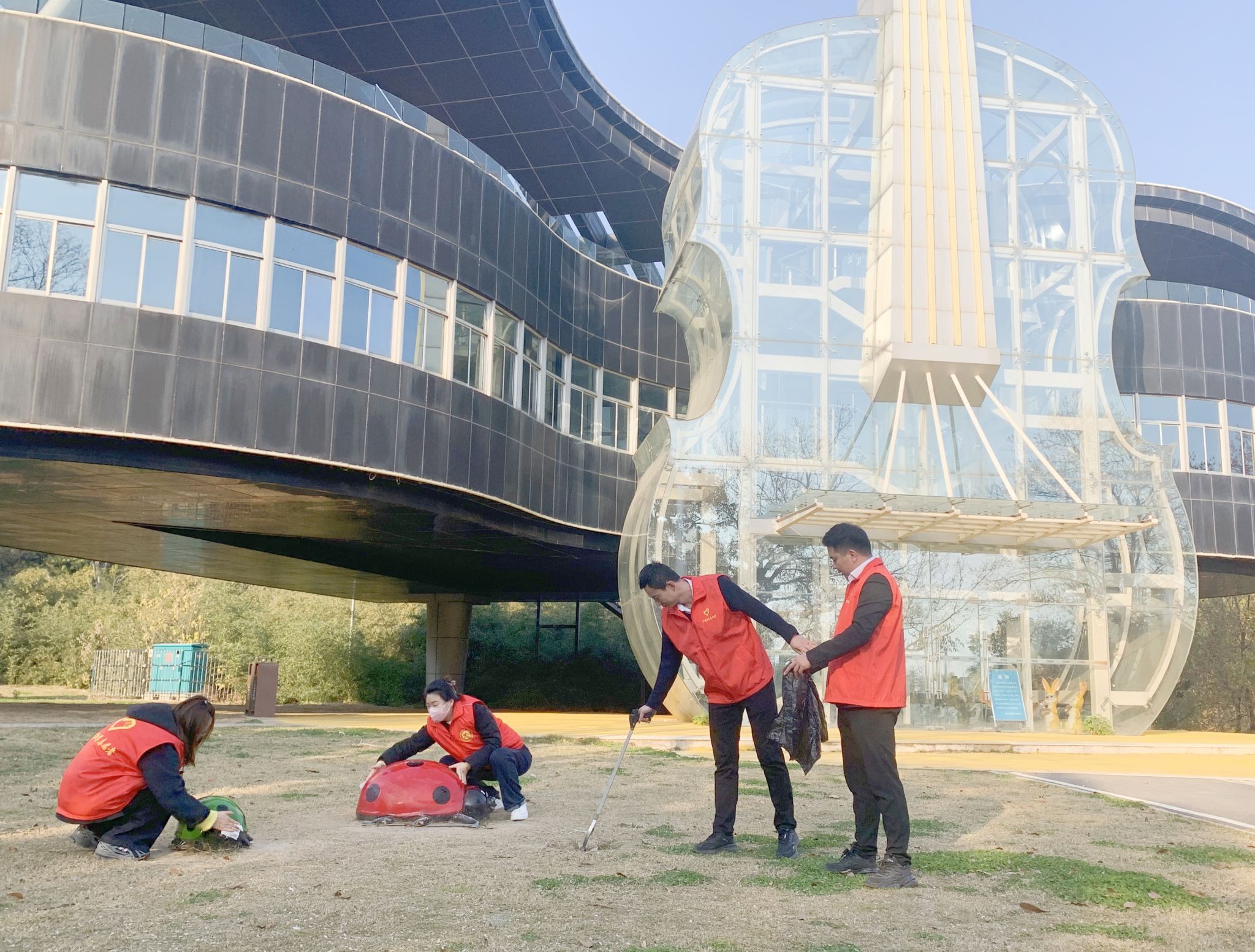 下午14:00,志愿者们身穿统一服装,手持清洁工具,分组对“两琴相悦”主体建筑及周边基础设施区域进行地毯式垃圾清理。在服务过程中,志愿者们不仅认真清扫烟头、纸屑、塑料袋等杂物,还积极向游客宣传环保知识,倡导文明游园、垃圾分类、低碳出行,获得现场游客一致好评。