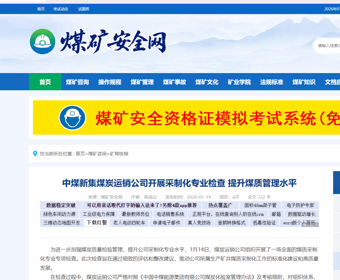 为进一步加强煤炭质量检验管理,提升公司采制化专业水平,1月14日,煤炭运销公司组织开展了一场全面的煤质采制化专业专项检查。此次检查旨在通过细致的评估和整改建议,推动公司所属生产矿井煤质采制化工作的标准化建设和高质量发展。