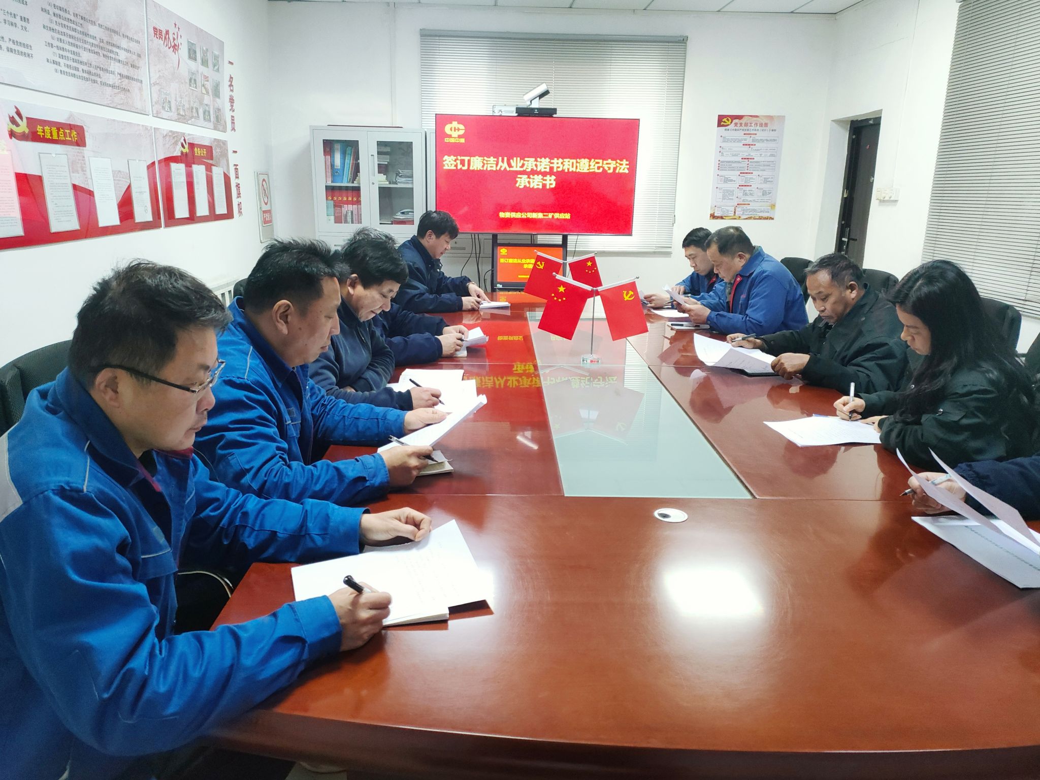 各基层党支部书记逐句逐条学习《廉洁从业承诺书》《遵纪守法承诺书》全文,详细解读承诺条款、纪律要求和责任内涵,结合物资供应岗位特点,强调了采购管理、物资调配、仓储保管等关键环节的廉洁风险点,谆谆嘱托全体人员,在新征程新起点上,要始终秉承“忠诚、求实、创新、奋进”的中煤精神,大力弘扬“勤奋、节俭、多奉献”的优良传统,将“两个承诺”内化于心、外化于行,做到“干事”与“干净”兼备、“勤政”与“廉政”同行,自觉坚守廉洁底线、不越纪法红线,共同营造“思廉、守廉、崇廉、护廉”的浓厚氛围。