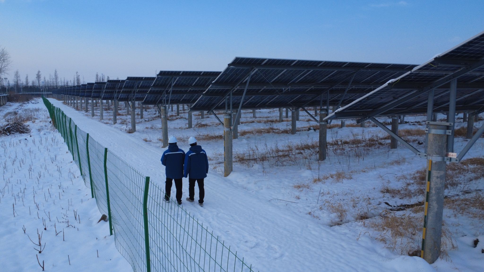 毛集专班严格恪守光伏设备运维规范,党员干部带头冲锋,顶风冒雪穿梭于积雪覆盖的厂区,牵头构建“空中巡查+地面精检”的立体巡检网络。无人机顶着寒风穿梭于光伏阵列上空,实现厂区设备全覆盖巡查,精准捕捉积雪覆盖、设备偏移等隐蔽问题;人工巡检团队则踏雪前行,聚焦组件、逆变器、箱变等核心部件,逐一排查线路连接、设备运行、安全防护等问题,细致记录每一项运行参数,不放过任何一处潜在隐患,在风雪中勾勒出履职尽责的坚实身影。