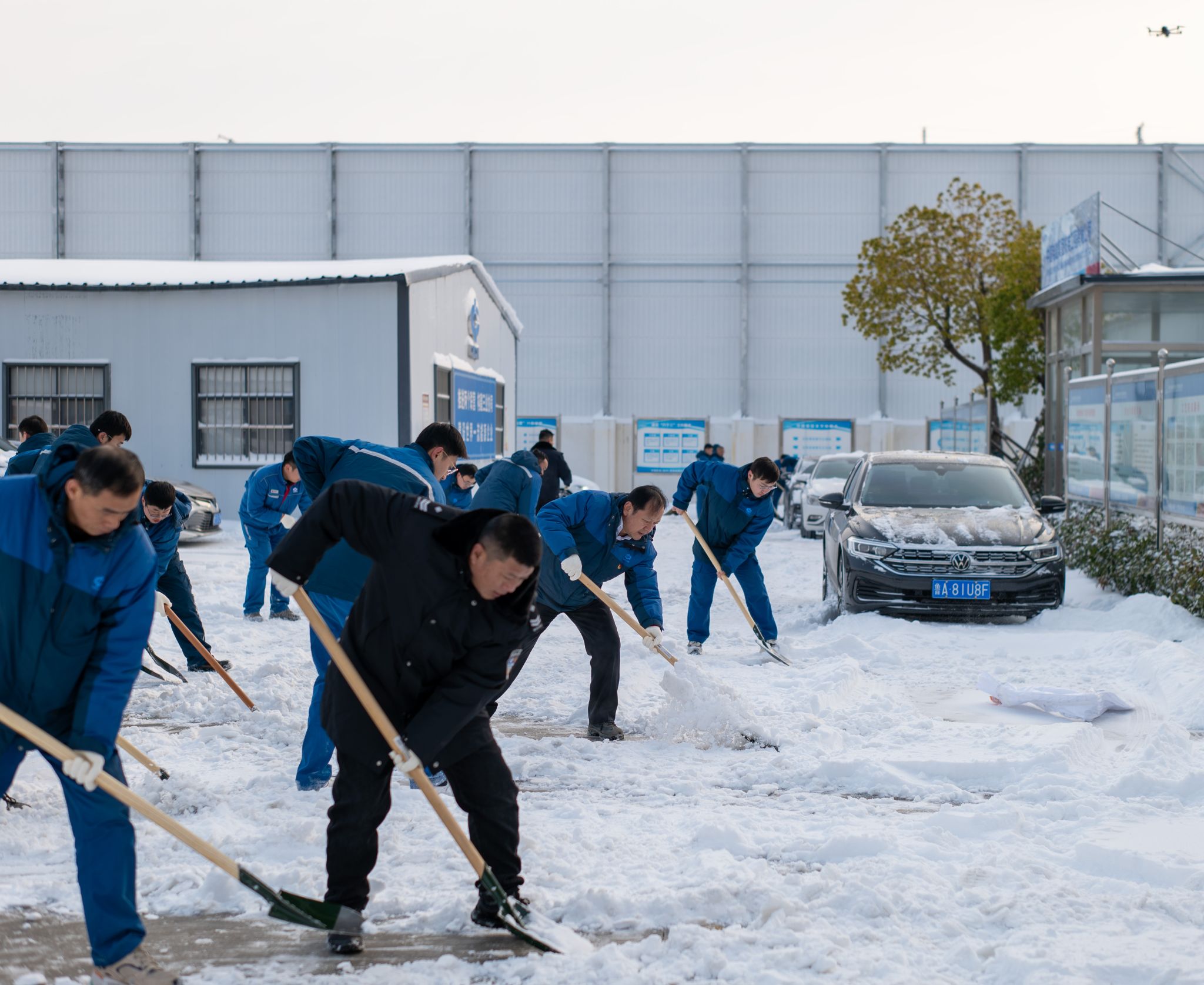面对积雪可能导致厂内车辆通行受阻、出入通道不畅、员工出行安全隐患陡增的局面,滁州发电公司临时党委高度重视,领导班子成员率先垂范、靠前指挥,带头拿起工具奔赴积雪区域。党员突击队立即行动,顶风冒雪,不畏严寒,重点对厂区主干道、临建办公区、巡检通道、检修楼周围及通往生产区域的路段进行集中清扫。凛冽寒风中,队员们分工协作,配合默契,有的奋力铲除压实积雪,有的细致清扫残余碎冰。经过一个多小时的连续奋战,厂区主要交通干道及生产保障通道的积雪被有效清除,为员工安全通行铺设了坚实的道路,也为恶劣天气下的调试和建设工作提供了有力保障,充分展现了党员的先锋模范作用。