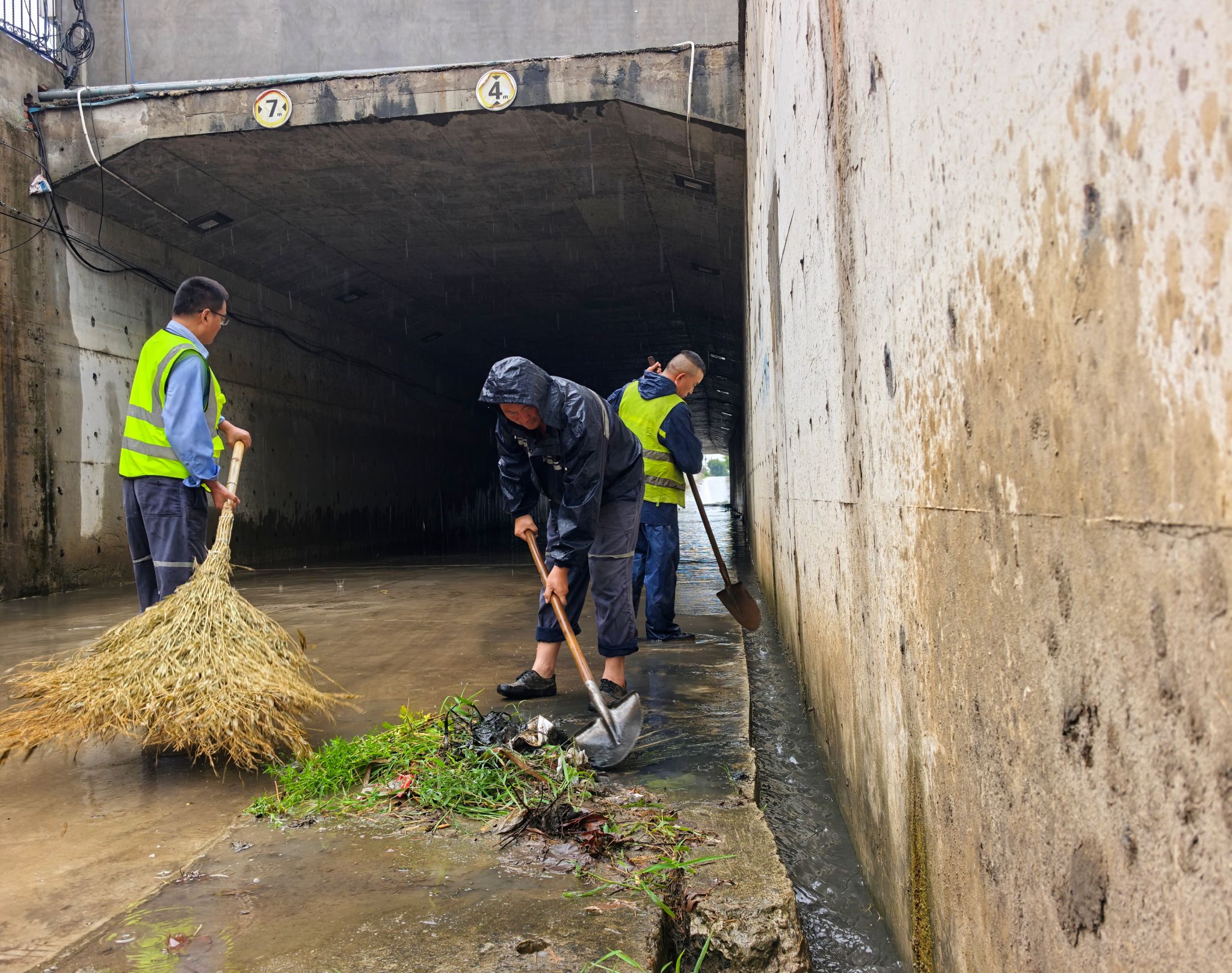 受强降雨影响,大量白色垃圾、枯枝落叶等杂物随雨水汇集,严重淤堵涵洞下水口,形成积水隐患,直接威胁线路设备稳定和行车安全。险情就是命令!工区立即启动防汛应急预案,抢险队员冒着瓢泼大雨,利用铁钩、铁锹等工具,清理堵塞排水口的杂物。雨水汗水湿透了衣背,泥浆沾满了裤腿,但他们毫不退缩,连续作战,最终彻底疏通排水通道,及时消除安全隐患。