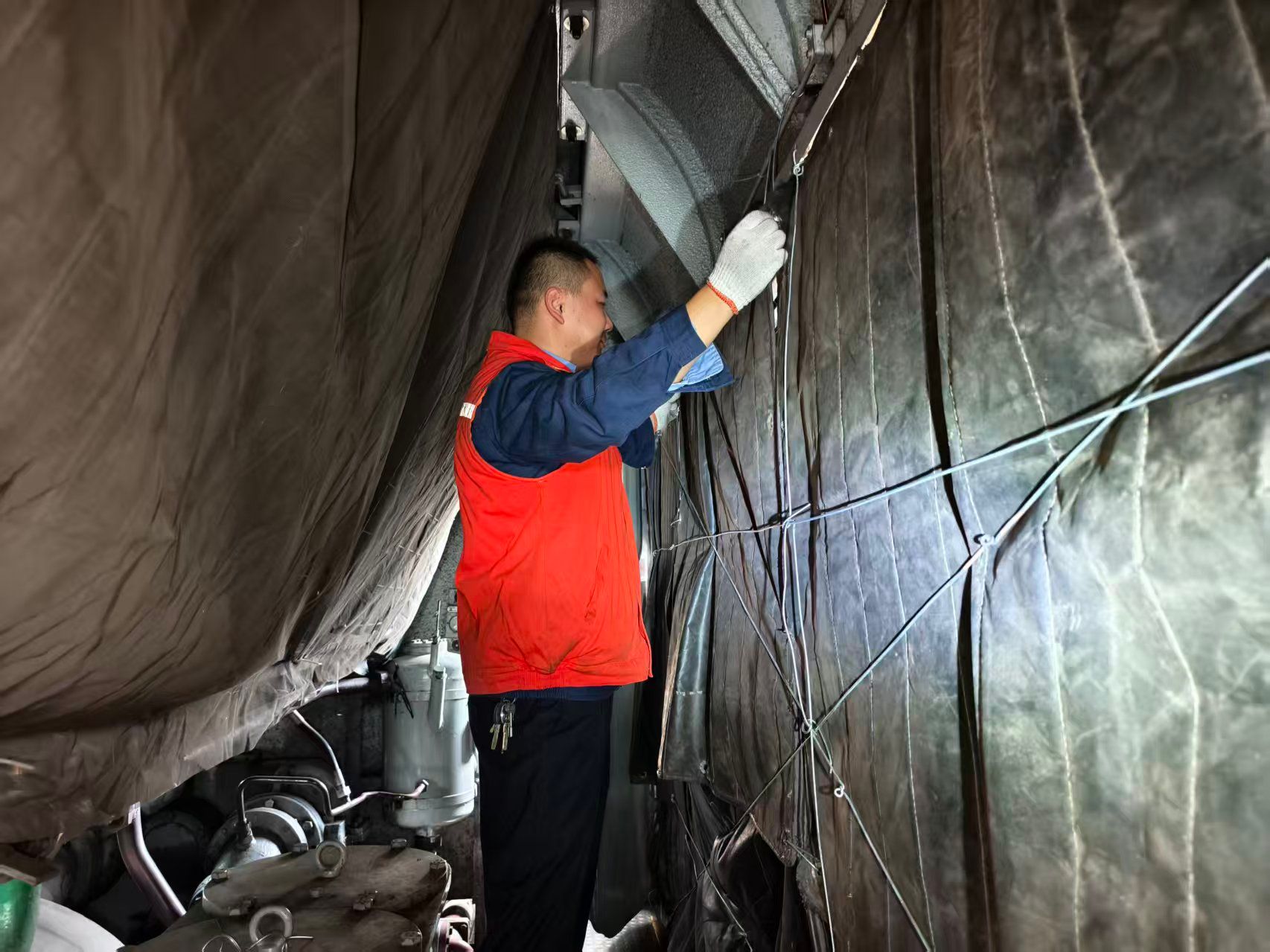 从严管控,筑牢“防护网”。车站细化责任分工,组织机班人员对每台机车开展“拉网式”全覆盖排查,聚焦燃油管路、水箱、制动系统等关键部位,重点检查保温防护设施完好情况,对老化、破损的保温层立即更换加固,彻底消除管路裸露、冻裂风险。严格落实夜间低温时段机车打温制度,通过定时巡检、精准控温,实现机体温度达标与能源高效利用的有机统一,确保机车始终处于“待命即能运行”的良好状态。同时,抢抓临修、整备等作业窗口期,推进机车防寒改造升级,为车体关键部位加装高效保温防护装置,全方位提升设备御寒抗冻能力,筑牢设备安全运行的物理防线。