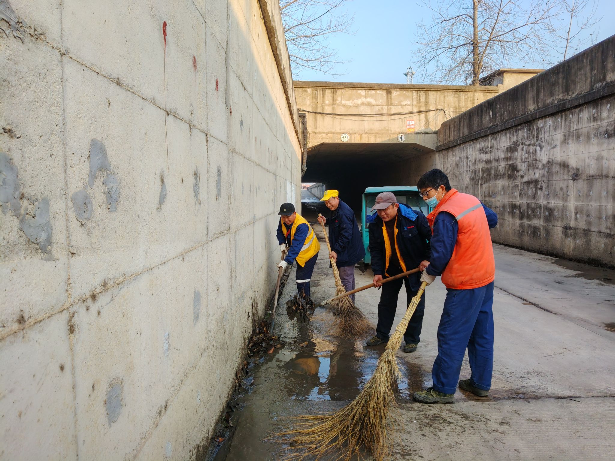 作业聚焦下穿涵洞易积水、易结冰、易堆积杂物等关键风险点。现场人员不畏严寒、分工协作,使用铁锹、扫帚、三轮车等工具,有序开展杂物清运、淤泥清理与排水疏通。针对涵内残留的枯枝落叶、生活垃圾及淤积泥沙,采取“人工清扫+机械清运”相结合的方式,确保桥涵内部畅通;同时对排水系统进行了全面检修,保障其正常运行,有效防范因极寒天气导致积水结冰带来的安全隐患。