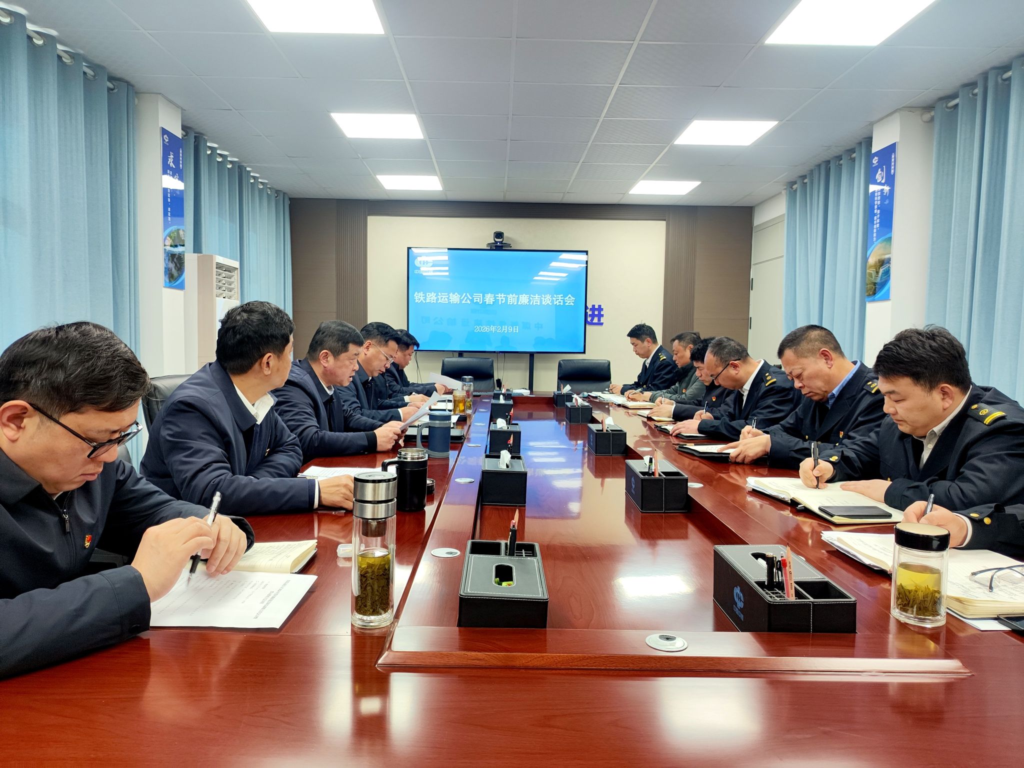 为持续巩固拓展作风建设成果,进一步强化党员干部廉洁自律意识,筑牢节日期间拒腐防变思想堤坝,营造风清气正、崇廉尚俭的节日氛围,2月9日,铁运公司党委书记、副经理童守军在三楼会议室主持召开春节期间集体廉洁谈话。围绕深化落实“我们一起过廉节”主题活动要求,对节日期间廉洁自律工作进行再提醒、再部署、再强调。铁运公司领导班子成员、机关全体人员、各基层单位负责人及关键岗位人员参加会议。