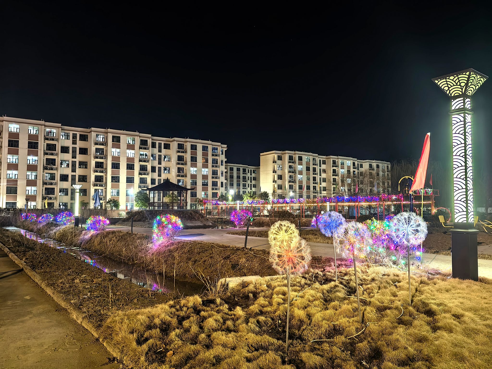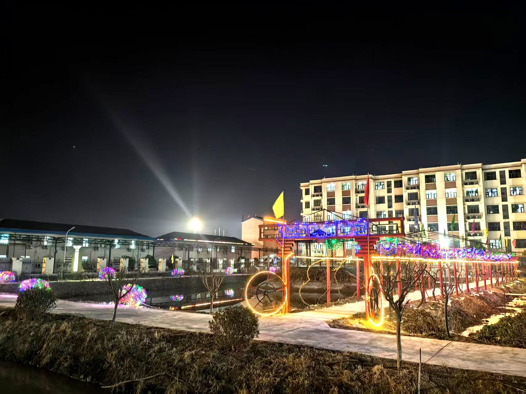 在铁运公司梁庄片区,工作人员精心布置的灯光景观格外引人注目。大门两侧悬挂着大红灯笼,映照着“平安运输迎新春”的烫金对联;办公楼檐下,流星灯如星河般倾泻而下,与缠绕在松柏上的暖黄色灯带交相辉映;广场的灯柱上,中国结造型的灯饰散发着温暖的光芒。夜幕降临时,整个院区灯火辉煌,成为一道亮丽的风景线。用灯带编织的“福”字灯笼吸引了往来职工驻足拍照。许多一线职工表示:“下班回来看到这么漂亮的灯光,辛苦一天的身心都放松了。”“虽然不能回家过年,但在单位同样感受到了浓浓的年味。”
