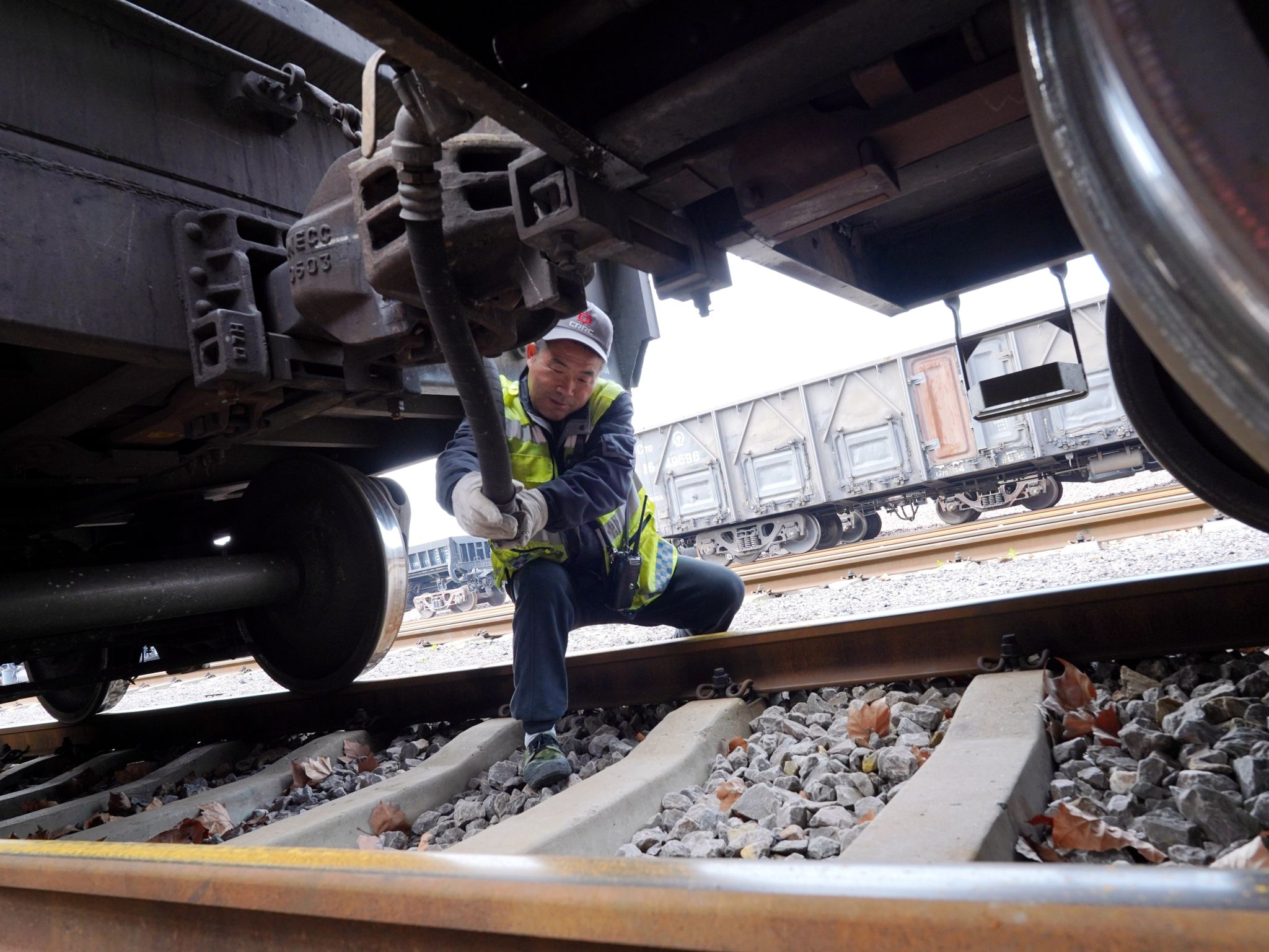 中午时分,列车已经整装待发。王师傅稍作休息后,新的作业计划又已下达,需要对到发场5道空料车进行编组,并连接好风管,进行试风作业。“连接好风管,就是给列车接上了‘脉搏’。”王师傅熟练地钻进两节车厢之间的车挡,一手抓着一根风管的接头,对准后用力一推,只听“咔哒”一声,连接妥当。随即,他敏捷地钻出车档,动作干净利索,丝毫看不出岁月的痕迹。