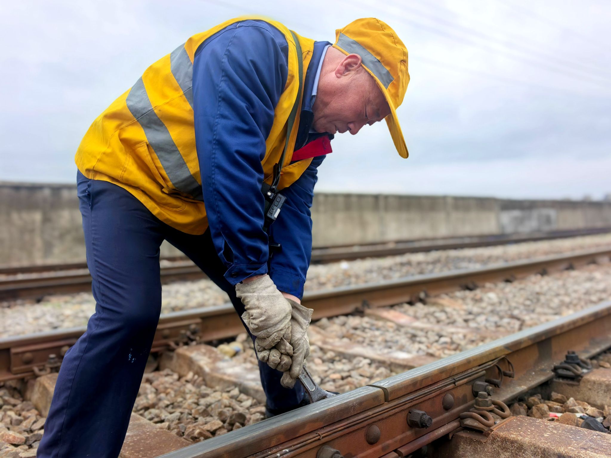 在道岔区段,他蹲下身子,拿起检查锤逐一对螺栓进行敲击检查,凭借清脆或沉闷的声响,快速判断螺栓是否松动。遇到列车通过,他迅速站立一旁立岗接车,任凭寒风裹挟煤尘拍打在脸上,依旧身姿挺拔、目光坚定。巡查至曲线地段时,他发现一处钢轨接头夹板螺栓松动、轨缝偏大,立即俯身进行紧固处理。厚厚的棉衣影响操作,冰冷的钢轨寒气逼人,他顾不上这些,反复用力拧紧每一颗螺栓,直到确认隐患彻底消除才站起身。一上午的时间,他已成功处置多处线路隐患,用细心与专业守住安全第一道关口。