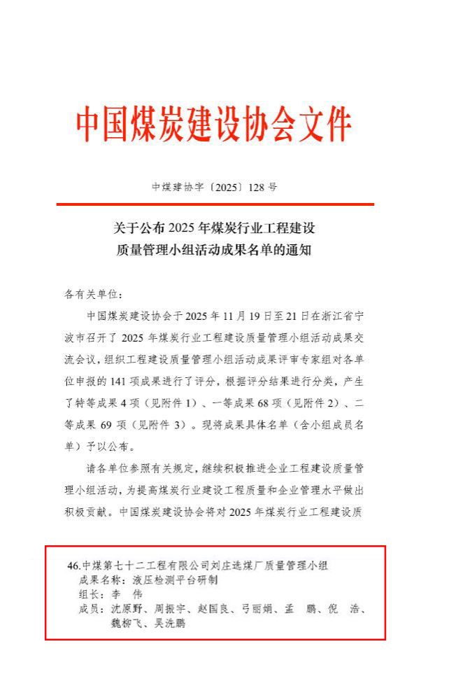近日,在2025年煤炭建设行业工程建设质量管理小组活动成果竞赛中,七十二公司QC成果《液压检测平台的研制》荣膺一等奖。