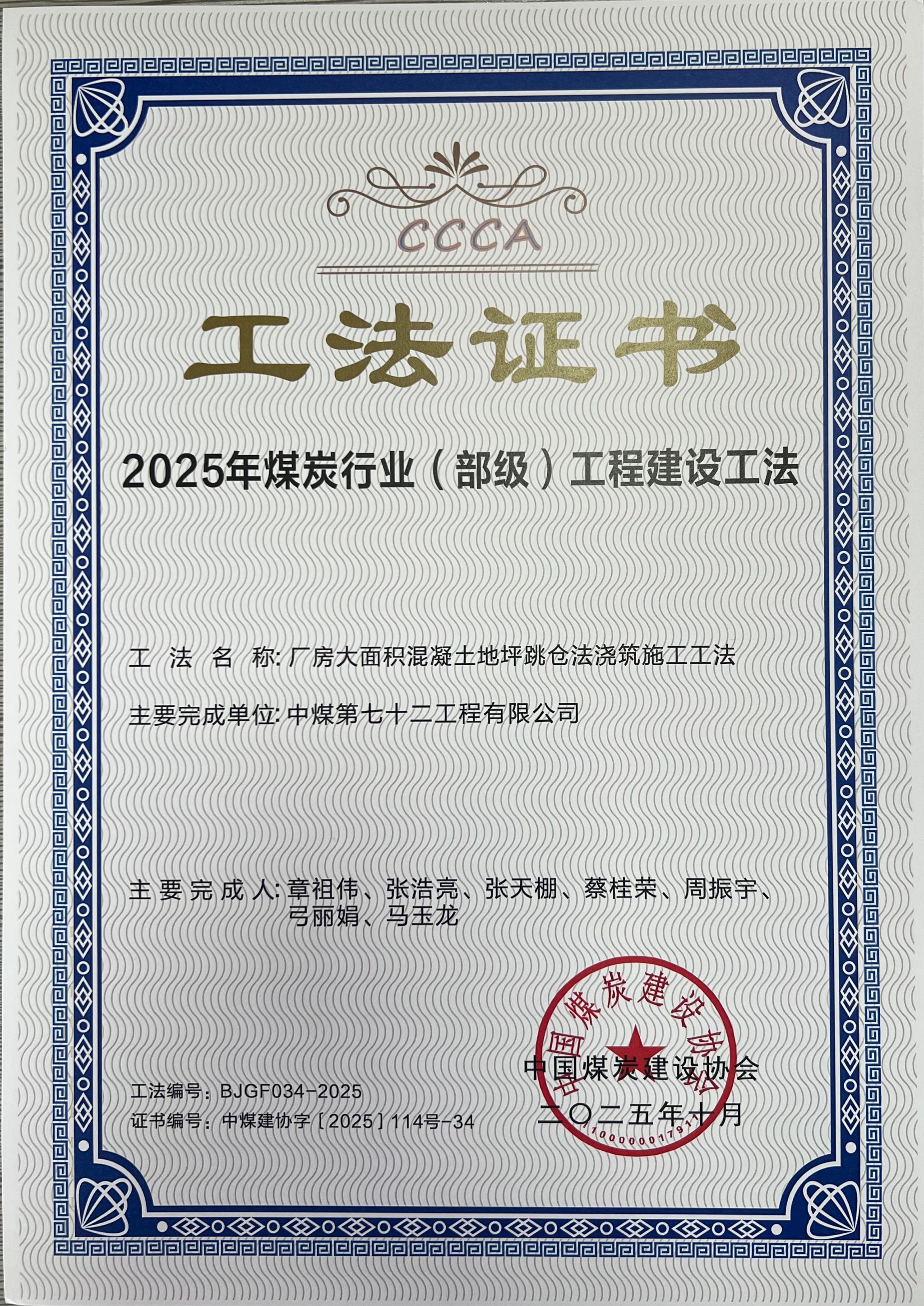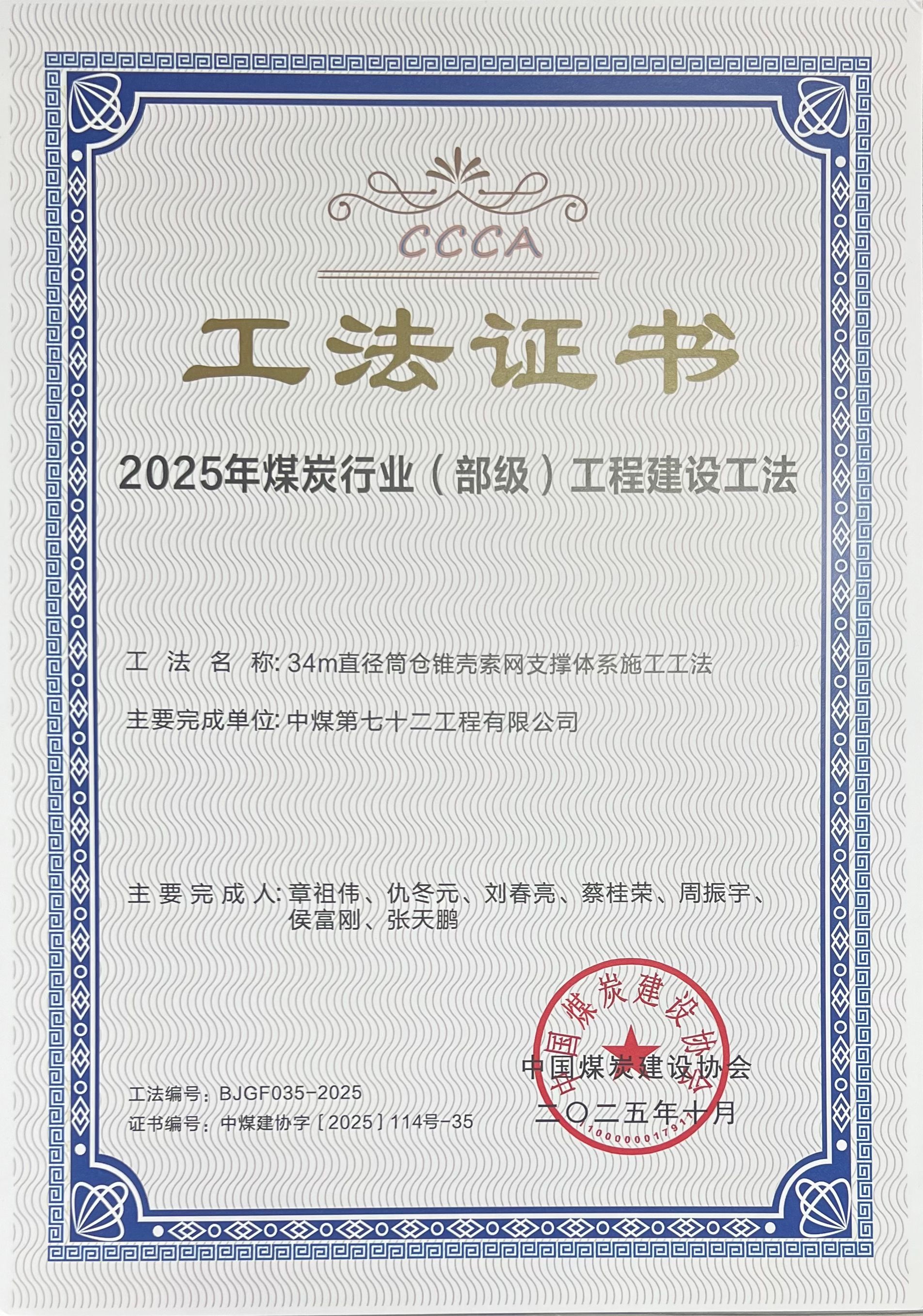 近日,七十二公司3项工法获得2025年煤炭行业(部级)工程建设工法,分别为《厂房大面积混凝土地坪跳仓法浇筑施工工法》《34m直径筒仓锥壳索网支撑体系施工工法》《复杂地势山区大跨度双线输煤管带机栈桥施工工法》。