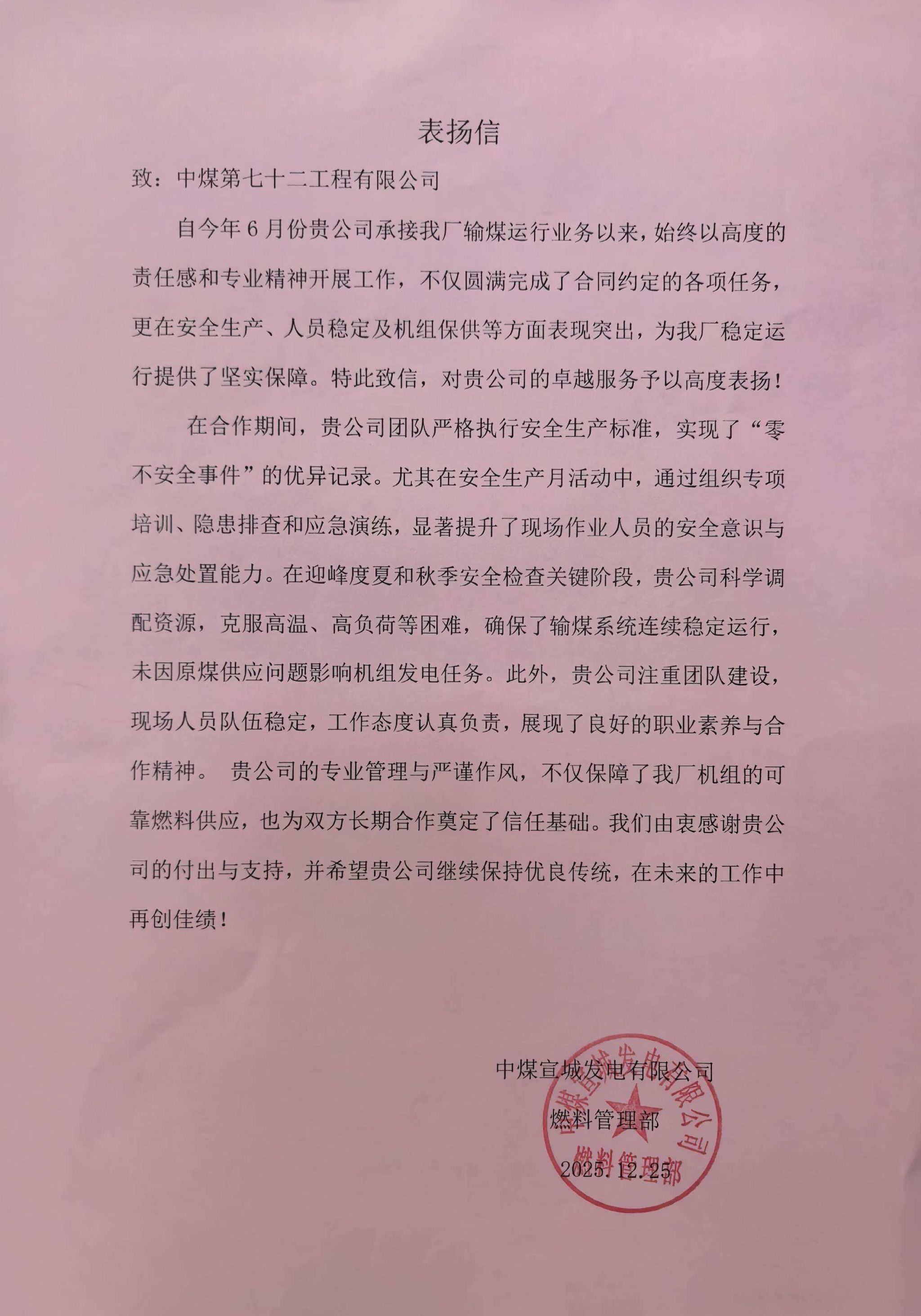 12月25日,七十二公司收到中煤宣城发电公司表扬信,对该公司的专业服务表示肯定,对项目团队的辛勤付出表示感谢,为后续深化合作打下了信任基石。