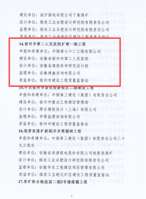 近日,七十二公司承建并申报的宿州市第二人民医院扩建一期工程,成功斩获2025年度煤炭行业建设工程质量高等级优良工程(经典)殊荣。该奖项是煤炭行业工程质量的权威认证,此次获奖不仅彰显了项目建设在煤炭领域的高品质,更标志着该公司工程建造与质量管理水平获得行业高度认可。