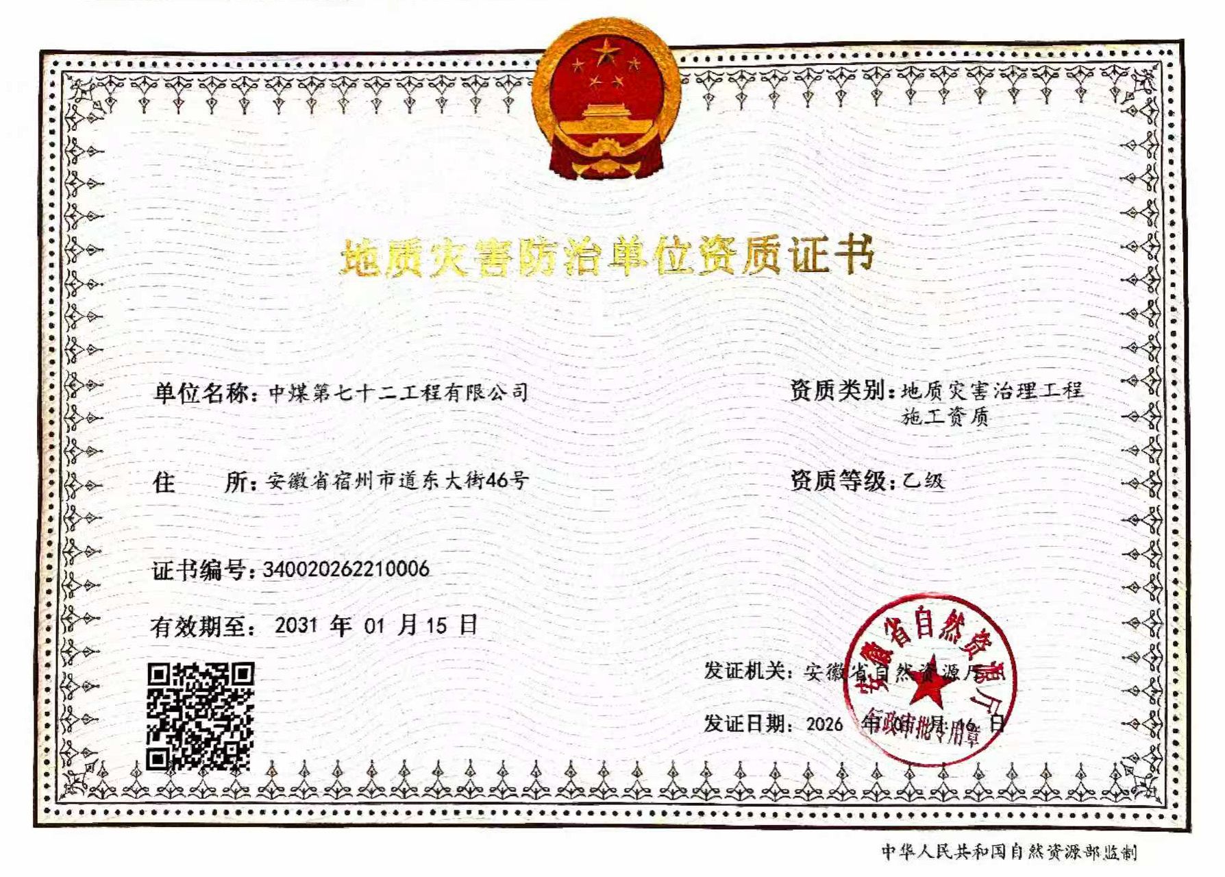 近年来,面对建筑行业整体下行和市场需求结构的深度调整,公司加快改革转型步伐,在资质建设上持续优化升级。此次资质的取得,将市场开发范围扩展至政策重点支持、市场需求稳定的地质灾害防治领域,为承揽矿山生态修复、滑坡治理、工程勘察设计等项目提供了有力支撑。双资质的配套落地,覆盖了从评估设计到施工建设的全链条,推动业务体系向专业化、综合化方向延伸,意味着公司具备了提供一体化解决方案的能力,为深耕地质灾害防治市场、打造新的业务增长极奠定了坚实基础。