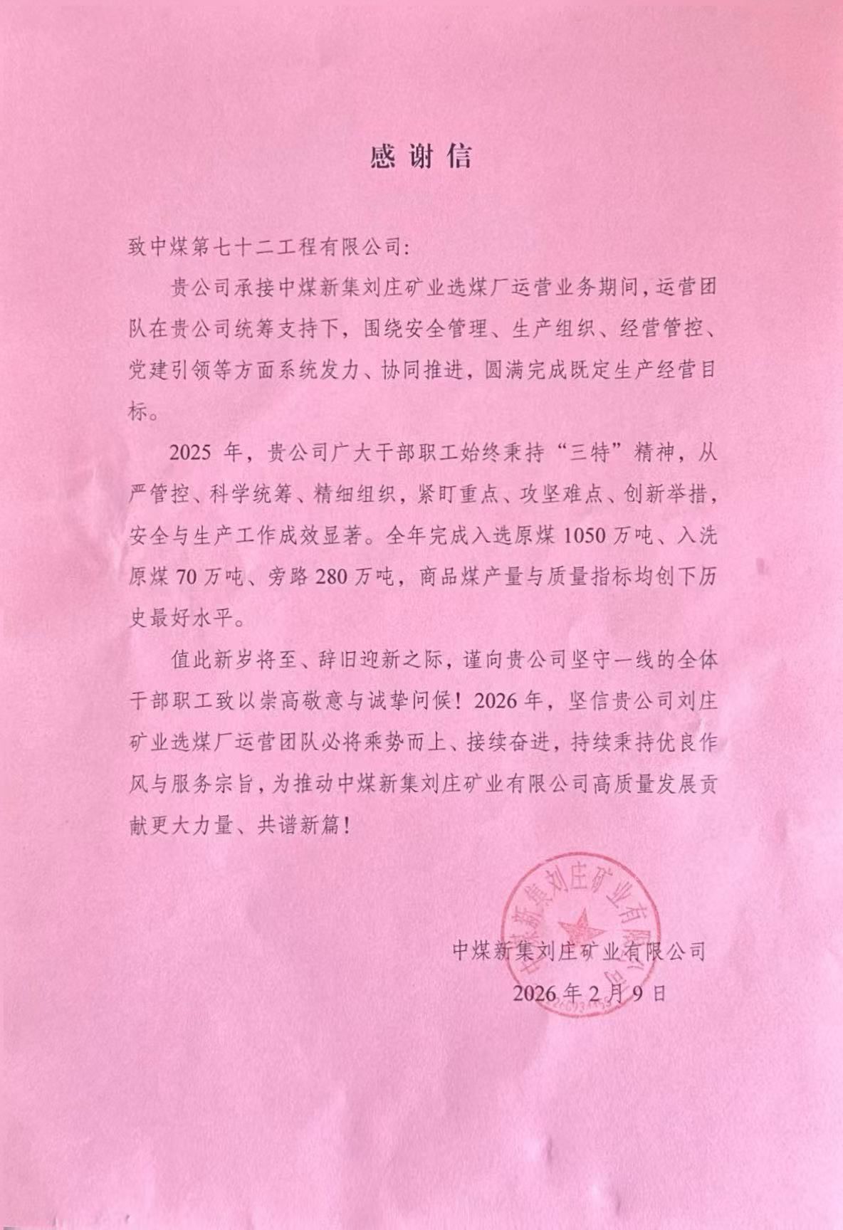 近日,七十二公司收到中煤新集刘庄矿业有限公司感谢信,对该公司在刘庄矿业选煤厂运营项目中展现的扎实作风与突出贡献给予高度评价,并致以诚挚谢意。